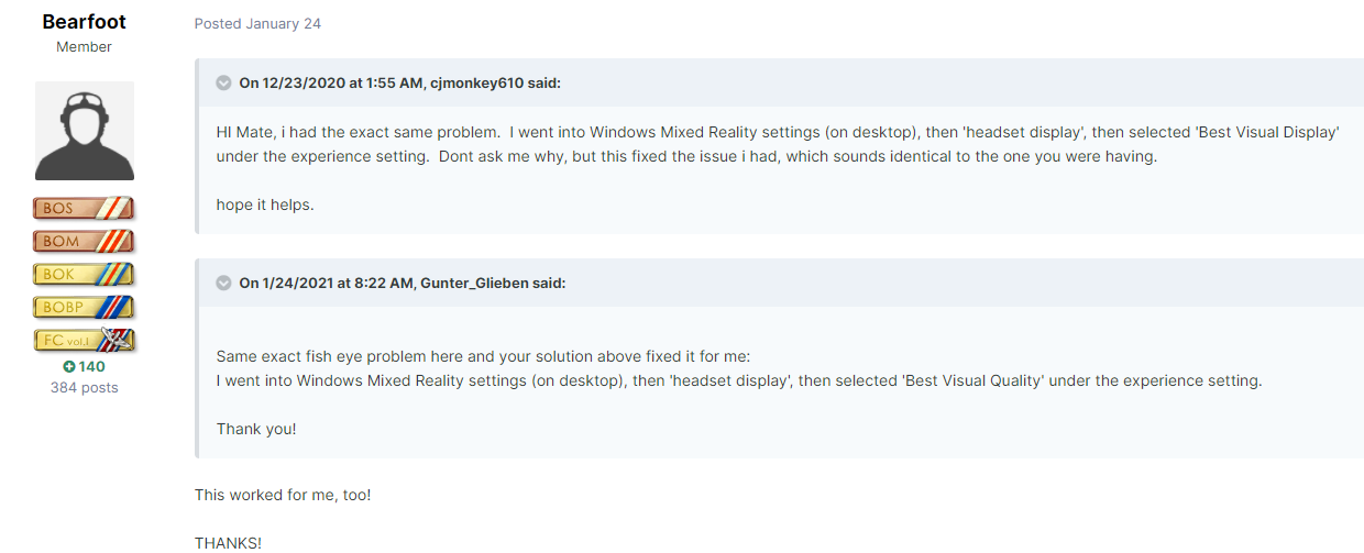 SCG_Euto Posted March 26, 2021 Posted March 26, 2021 On 3/22/2021 at 11:26 PM, chrisnj96 said: I had tried all other WMR settings except the refresh rate (didn't realize it had a windows decide) which lead me to posting here. If you set the Mixed Reality Portal Tool to something other than Best Visual Quality, you will even get a weird fisheye distortion.