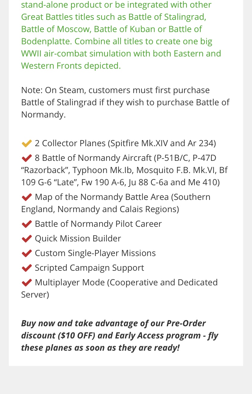 Stinger64 Posted April 20, 2021 Author Posted April 20, 2021 Thank you both wellenbrecher and von_Tom It says in the Batle of Normandy Advertising page: "The Premium Edition contains eight standard aircraft and two collector aircraft. The two included Collector Planes are; the British made Spitfire Mk.XIV and the advanced German built twin-engine Arado Ar 234 jet bomber. These two aircraft bring the total amount of included aircraft to ten in the Premium Edition.IL-2 Sturmovik: Battle of Normandy is part of the IL-2 Great Battles series and can be played as a separate stand-alone product or be integrated with other Great Battles titles such as Battle of Stalingrad, Battle of Moscow, Battle of Kuban or Battle of Bodenplatte. Combine all titles to create one big WWII air-combat simulation with both Eastern and Western Fronts depicted.Note: On Steam, customers must first purchase Battle of Stalingrad if they wish to purchase Battle of Normandy. 2 Collector Planes (Spitfire Mk.XIV and Ar 234) 8 Battle of Normandy Aircraft (P-51B/C, P-47D “Razorback”, Typhoon Mk.Ib, Mosquito F.B. Mk.VI, Bf 109 G-6 “Late”, Fw 190 A-6, Ju 88 C-6a and Me 410) Map of the Normandy Battle Area (Southern England, Normandy and Calais Regions) Battle of Normandy Pilot Career Quick Mission Builder Custom Single-Player Missions Scripted Campaign Support Multiplayer Mode (Cooperative and Dedicated Server)" ... I think I'm not understanding this... ! Other question is that I have thru Steam aqquired all other versions, Battle of Stalingrad, Battle of Moscow, Battle of Kuban or Battle of Bodenplatte. Combine all titles to create one big WWII air-combat simulation with both Eastern and Western Fronts, but how can I do this? I've included on Steam the Normandy version so it appears included in Stallingrad version but no content, again. hould I install it inside Stallingrad folder? I have already saw in youtube some videos of missions of normandy, why don't I have access to the maps, etc.? Thank you for yor disponibility to answer me, be patient, please... I took out my email, thanks for the advice, von_Tom Nice fights! Rui Ferrão