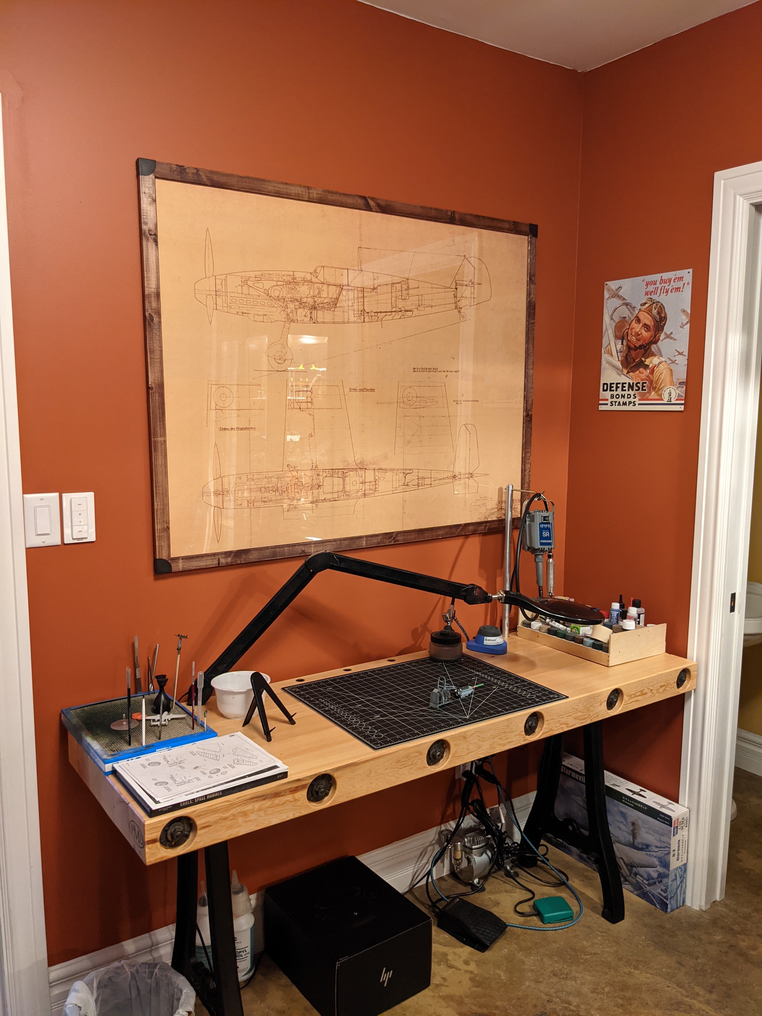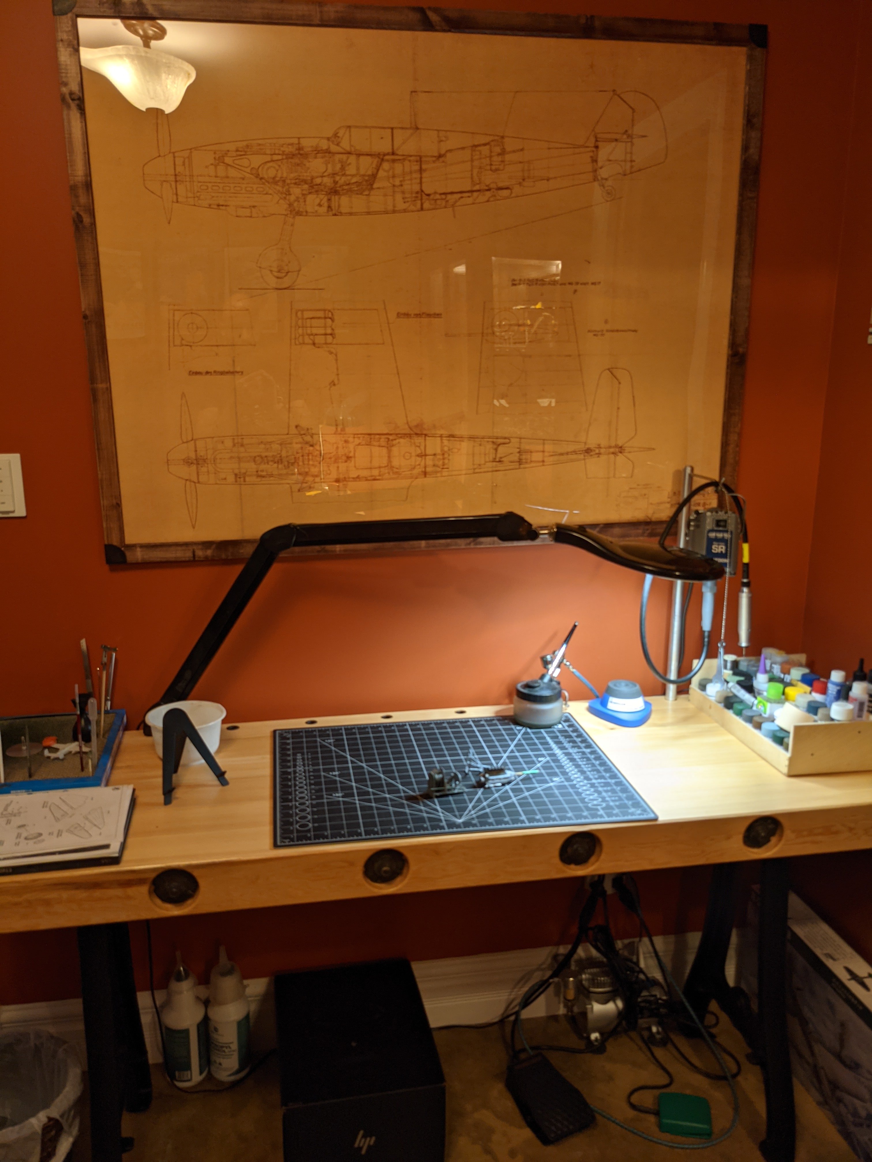 40plus Posted August 26, 2021 Author Posted August 26, 2021 More office/gaming room/modeling table progress to share. I just finished this art project. It started as an eBay purchase of a DVD of high resolution scans of original BF-109 factory blue prints. I had my favorite one printed at 36"x 48". I then had to build a frame to hold it. That was a lot harder than I had thought because the image itself was printed on a rather heavy paper and had quite a lot of weight to it. At any rate, this frame is made from wood, acrylic, steel and aluminum and, in my opinion, is perfect. It's now hanging above my in progress model building table that over been working on all year and is still waiting for me to build functional storage for.....I guess I'll do that next. 3