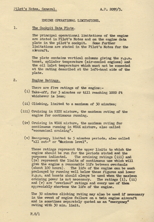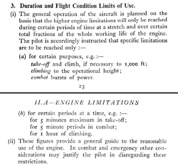 Talisman Posted May 14, 2021 Posted May 14, 2021 16 hours ago, 41Sqn_Skipper said: The engine limitations are explained in Pilot's Notes General. AP 2095 Pilot's Notes General (published in June 1941): AP 2095 Pilot's Notes General Volume 2 (published April 1943): ... As you can see the time limits changes during the war (climb duration from 30 min in 1941 to 1hr in 1943), but they are the same for all engines. Which is of course achieved by choosing limiting the RPM and boost as necessary. Good gen Skipper The AP 2095 Pilot Notes General were to be read by pilots in conjunction with the pilots notes for individual aircraft. The Pilot Notes General put the individual aircraft pilot notes into context concerning the wider picture and underpinning policy. For me, one of the big take-aways from the Pilot Notes General is that the engine limitations in the individual aircraft pilot notes are a general guide and that they may be disregarded by the pilot in combat and other emergency situations. I am not aware of any such similar instructions for Axis pilots authorising that they may disregard engine limitations in the same way. Perhaps, for historical accuracy, British aircraft pilots should be allowed to disregard engine limitations in combat in this combat flight simulation, without the in-game unhistorical engine timer damage modelling. Happy landings, Talisman 1