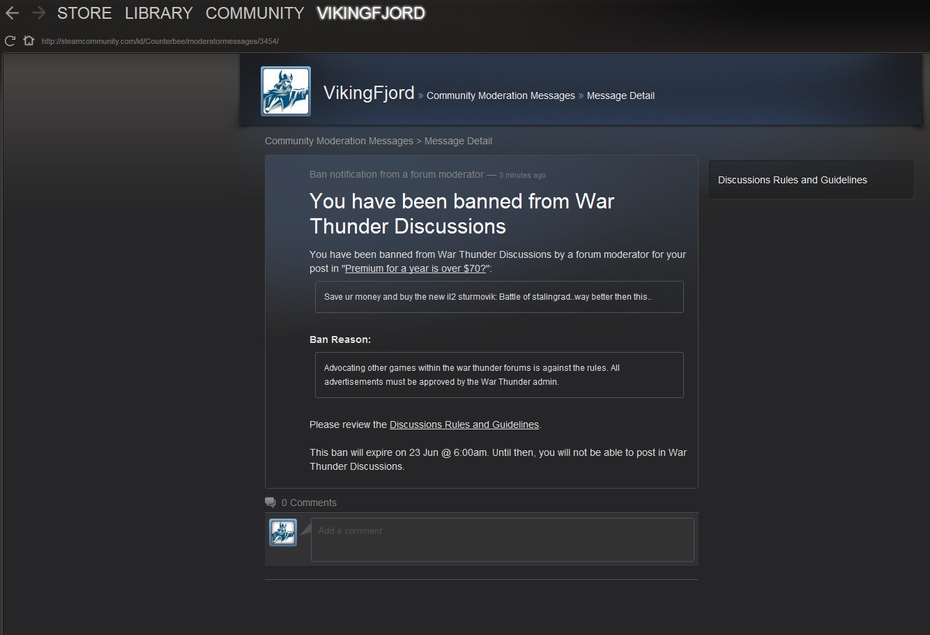 VikingFjord Posted June 16, 2014 Author Posted June 16, 2014 its different there is a difference between recommending someone to buy something else then to advertisingand then its the ban time..and punishment in general if i would on purpose advertising a product in here i would get 1day banWar Thunder forum for recommending/giving a guy advice on how to spend money = 1 weeki would have to break this rule #8 3times in here before reviving similar punishmentbut sure i have myself to blame not seeing what war thunder admins for what they arebut could a admin tell if i would be banned or not in here for saying something is better when another user ask?and what about this user that provoked a statement of advice/advertising would he get banned?8. You cannot use the forum for advertising other products. Sending advertising materials through personal messages and placing advertising materials in signatures, profiles and avatars except personally agreed to by 1C-777 Limited is prohibited. All such incidents will be deleted without warning. Discussion of other games is only allowed in designated sections of the forum and will be stopped if the discussion becomes an advertising vehicle.Violations of this rule will result in the following: First offense - 1 days ban on entrySecond offense - 3 days of the ban on entryThird offense - 7 day ban on entry