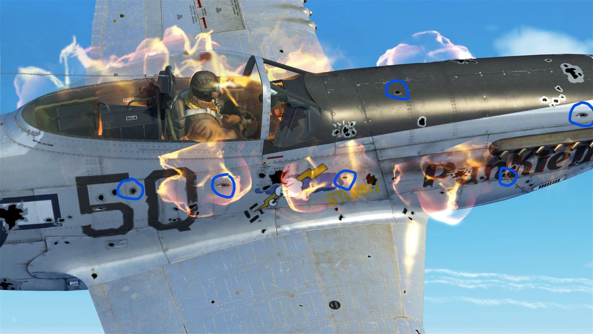 oc2209 Posted May 18, 2021 Posted May 18, 2021 I know I'm getting ahead of myself here, since the new damage visuals are only used on the P-51 so far. However, when all planes are fully converted to the new visuals, I propose we're given a menu choice wherein we can decide whether to use the old decals and the new together, or use them separately. I know that the devs have stated the new decals are meant to be used in conjunction with the old ones. I understand the appeal of having obvious signs of plane damage discernible from a distance. However, I think that the old decals detract from the quality of the new ones, and ultimately are too 'video gamey'. They can make a plane appear shredded and no longer airworthy, which only adds to confusion (especially among new players) as to why our targets simply refuse to fall out of the sky even when they're apparently ready to fall apart. Example: I've circled what appear to be the new damage decals. I might've missed a few. These are all done with German 13mm. As you can see, the subtlety of the new decals is lost. The old decals are much more obvious. Again, I can see why people, primarily in multiplayer, would want really obvious signs that their target is damaged, and where it is damaged. But I see little value in it for single players. An advantage to the new system is that we can study our replays in detail to improve our gunnery (or just watch it for fun); and we can see where most bullets made an impact. The old decal system just gets in the way of these studies.