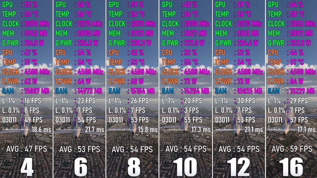chiliwili69 Posted May 20, 2021 Posted May 20, 2021 1 hour ago, Reinhardt said: Can this game utilize more cores and threads? IL-2 has several threads, but one of them is the heavy thread which bottleneck the final fps achieved (assuming GPU is not constrained). So, according to my tests, having more than 4 cores is not an advantage for IL-2 engine. Using Hypertreading doesn´t give either any extra fps. What it is important is the IPC and the CPU clock of the CPU. In the SYN_Vander benchmark we did several test and the best CPU are 5600x/5800X/5900X/5950X or the new 11th gen of Intel (11600K, 11700K, 11900K). So if you upgrade don´t go for the 10th gen, since the gain will be very small in your case. 1 hour ago, Reinhardt said: Also, is the GTX1060 6Gb enough to achieve ~100fps in 1080p, max settings? Some settings affects the CPU, other affects the GPU and other both CPU&GPU. The GPU is impacted by the Cloud setting, MSAA, and perhaps shadows. Try to fly with no clouds and no MSAA to unload GPU, and then put all other settings to Off/low. So you will know what is your max achieable fps, and from there start to increase settings at your choice. Here some guidance about what settings impact the CPU: 1 hour ago, Reinhardt said: Not sure if the new rendering relies on the CPU or GPU. Building the geomatric scene is done by CPU (How many objects, explosions, bullets, damage model, flying model, etc) Then, when this is done, the GPU does the render (here higher clouds require more complex render, MSAA require more sampling, more resolution like 4K require more pixels). 2 1