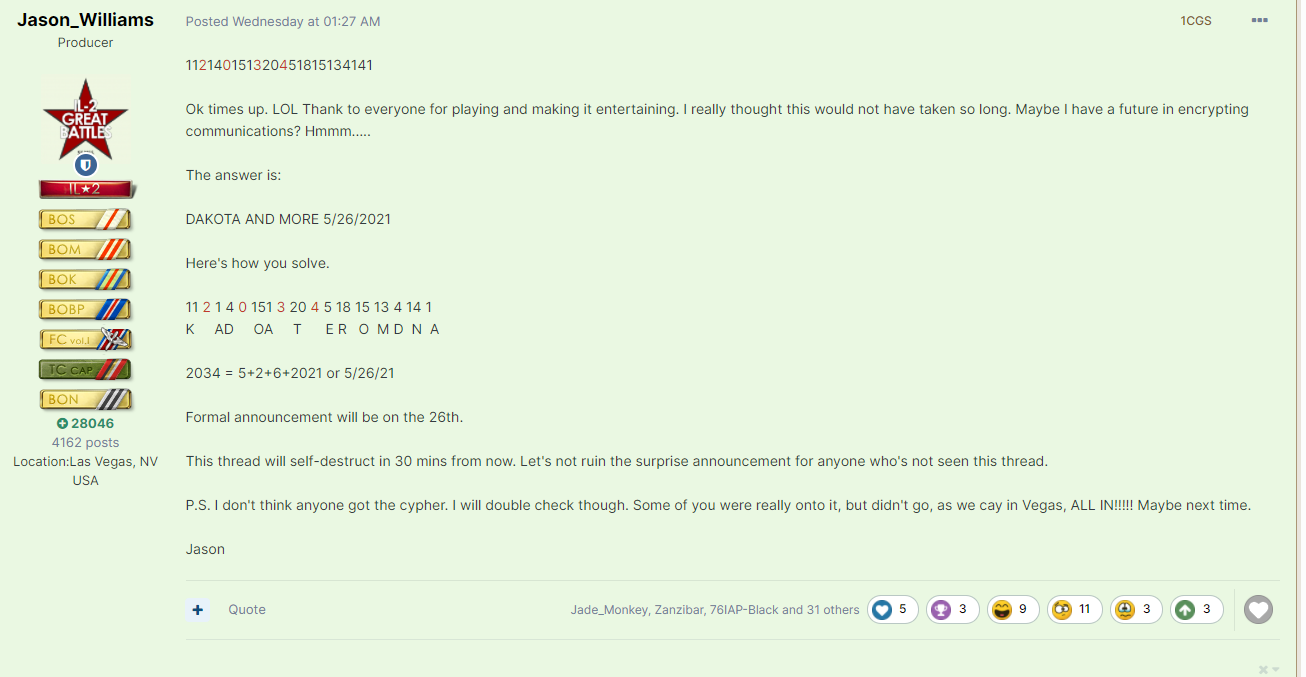 SirFlappy Posted May 24, 2021 Posted May 24, 2021 (edited) The thread started with just a ( . ) fullstop/decimal point/dot whatever you want to think that means! PS- I dont know if its OK to post this...I guess if not they will remove it..sorry if thats the case. 3 hours ago, AEthelraedUnraed said: Well, I can understand that they want to remove the answer so that it remains a secret until the official reveal date, but can someone at least tell me what the message was so that I can have a go at decrypting it myself? Missed the whole damn thread... Edited May 24, 2021 by SirFlappy 1