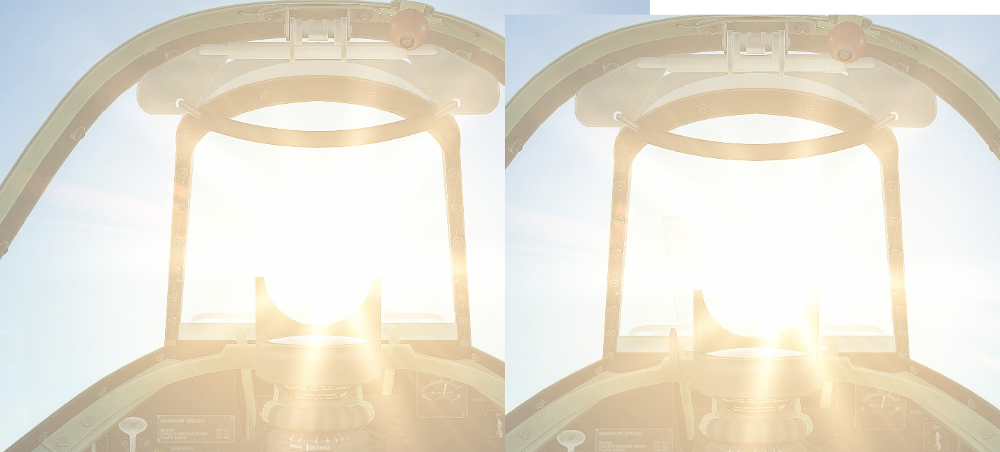 Gr3y Posted May 28, 2021 Author Posted May 28, 2021 (edited) 11 hours ago, AEthelraedUnraed said: What do you expect to see then? Not much, just less sun glare and something similar to the real photo I've posted (meaning much darker effect). 11 hours ago, AEthelraedUnraed said: I don't see much of a problem here. AFAIK the sun filters were not designed to deal with reflections (i.e. not polarised), and in all likelihood the filters themselves reflect light just as much as the canopy. Since the sun filter material is darker/different it shouldn't reflect light just as much as the conopy, also the filter is smaller and the pilot would cover much of the sight with his body preventing the sun rays from directly affecting the filter that much. For some reason on the screens I've posted we can see that the front glass is affected by the reflections a lot, while others aren't, which seem quite strange and this is the main source of the problem with tracking. 11 hours ago, AEthelraedUnraed said: Try it in an extremely bright setting, with white clouds or snow in the background. Anyway I've took some more screenshots in various "bright setting" and still it improves nothing (well it gets just a little bit darker, but that's it, I don't believe it would be beneficial in any situation, hence none would see the difference in the fight outcome if they were to remove it). Sun glare is not affected at all. 1 - clouds - no effect at all, but they are not too thick 2 - snow with sun from the back - doesn't really improve anything 3 - sun with sun from the front - no problem wheter we use it or not 4 - direct sun - no glare reduction at all Edited May 28, 2021 by TrueGrey 1