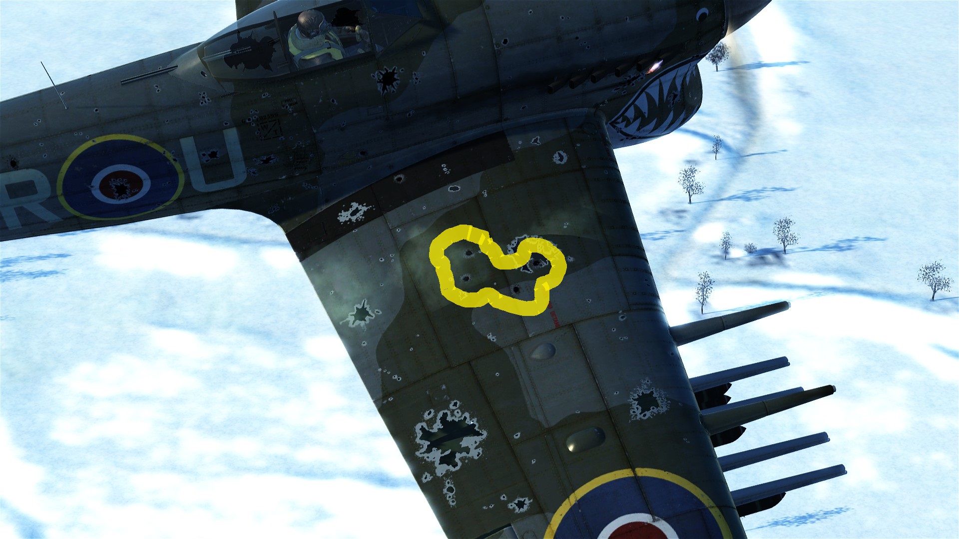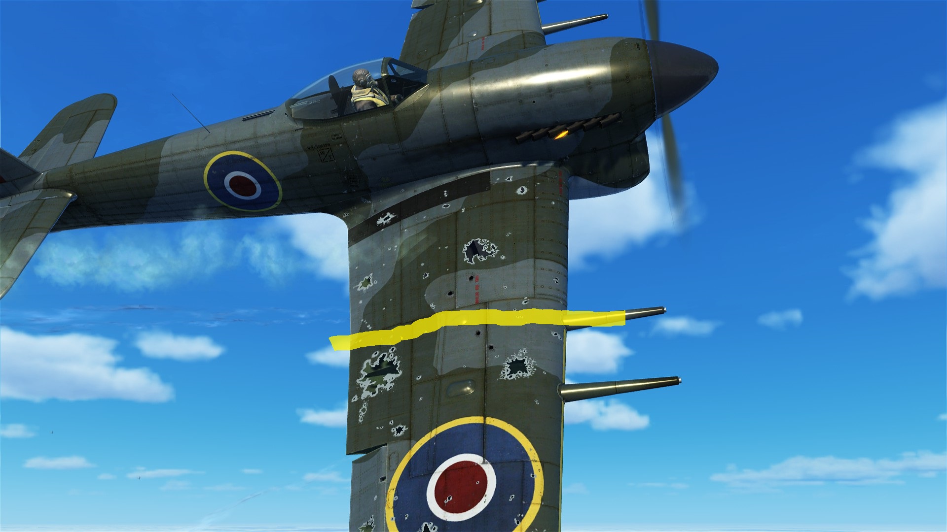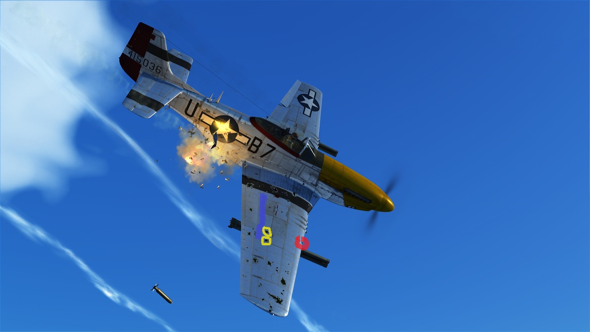 oc2209 Posted July 3, 2021 Posted July 3, 2021 2 hours ago, Yak_Panther said: The HE shell damage decals are not representative of what is taking damage because they are applied to a large area. This is why it's important to control the variables in your testing regime. You can't infer the effects of a shell because you can't even be sure what's taking damage in your "tests". I just want to be perfectly clear on how the damage model and visual models work. Here's the P-51 getting hit in 1/32 speed: Spoiler And here's a still shot: I drew an indigo line to represent the likely location where the aileron controls are. The yellow circles are where the 2 hits landed that I believe disabled the aileron controls. The red circle on the leading edge of the wing is a strike made after the first two near the aileron. Am I to believe that the impacts indicated by the yellow circles, and their proximity to the ailerons, are in no way related to the probable destruction of the aileron controls? And that the subsequent hit to the leading edge of the wing is just as likely for having caused the aileron breakage? Despite the fact that we can clearly see tracer going over the leading edge of the wing long after (relatively) my first hits landed? My hits went from the trailing edge of the wing to the leading edge and beyond. Then I paused, fired again, and that's where the wing root hits begin.
