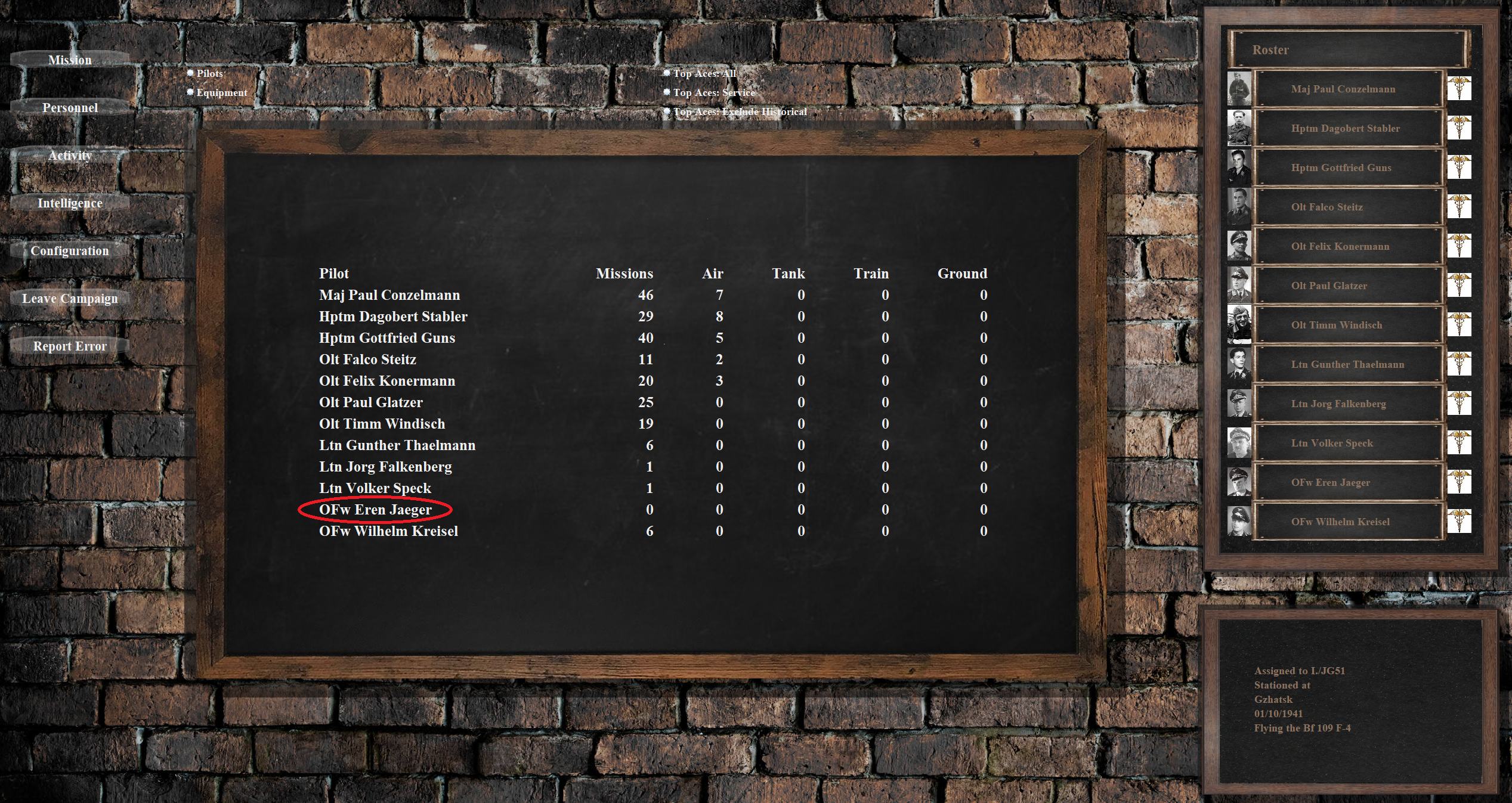 Oskar_GD Posted July 6, 2021 Posted July 6, 2021 (edited) OFw Eren Jaeger / Assigned to I./JG51 / Stationed at Gzhatsk / 01.10.1941 PWCG Version 12.3.1 (default settings, except: Max Pilot Injury=4 and Air Density=Med) I dont need a reward, Im just interested how far I will go. Salute. Скрытый текст PS. I want to offer to create a list of top 10 aces in this topic. For example: 1. Virtual pilot (nickname), His pilot in PWCG (name and squadron), number of sorties and kills. 2. ... 3. ... Edited July 6, 2021 by Oskar_GD 1