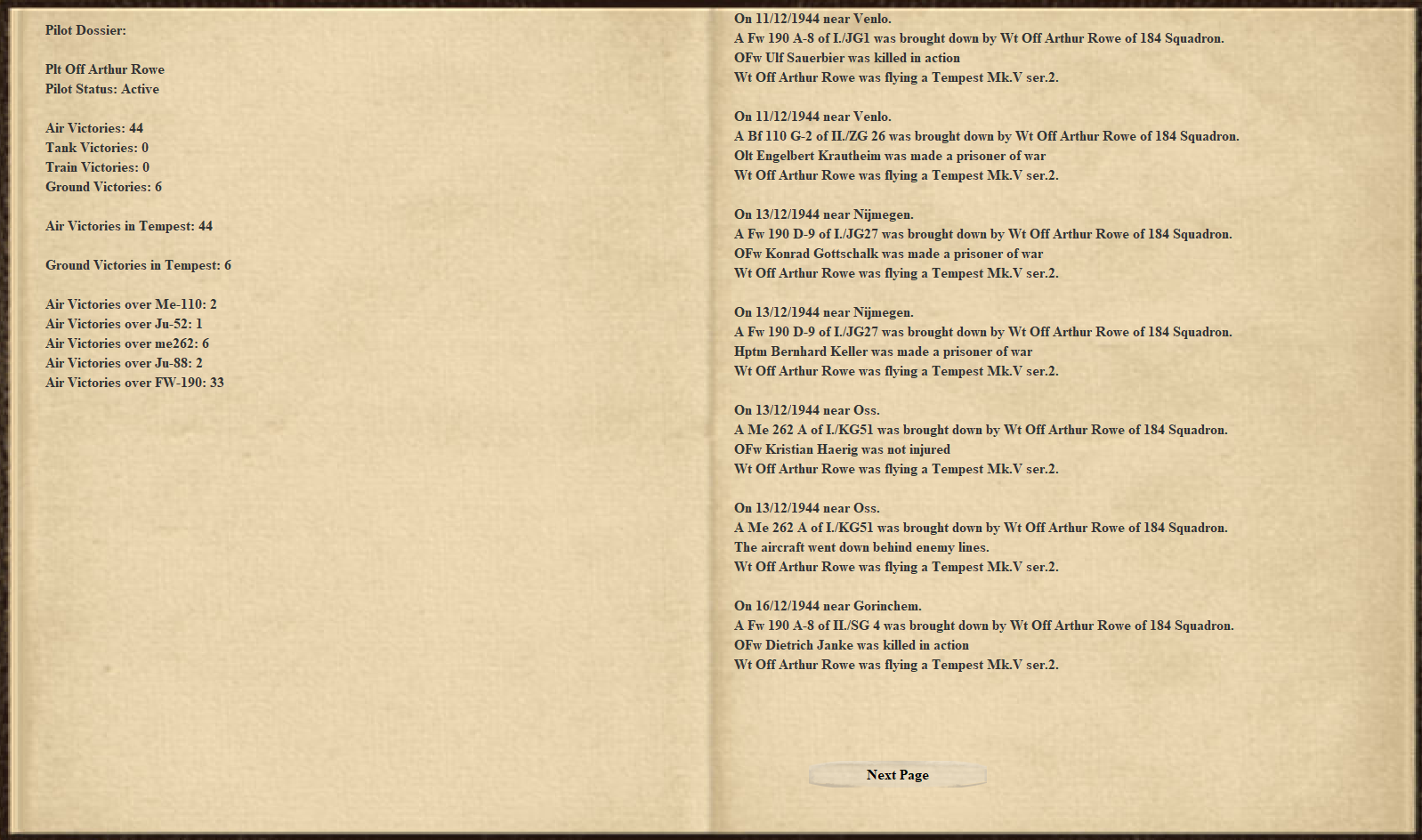 justin_z3r0 Posted August 14, 2021 Posted August 14, 2021 17 hours ago, justin_z3r0 said: Arthur experienced his first victories on his first Sortie. one Fw 190 and one Bf-110. Although The 110 shot him up a bit causing a fuel leak in his right wing. He was able to back it back to Grave from the Venlo area where the fight occurred. The rest of his flight landing at Venlo. A flight of Spit Mk IXe were in the area too enabling an 11:2 kill ratio for the allies. Not a bad start to Art's Tour. 2 air victories After 3 more missions with enemy contact Arthur has increased his count to 12. The tempest packs a helluva punch, and gobs of speed. Shes thirsty but carries enough fuel to linger around much longer than the Spit XIV can. And much less twitchy in the Pitch axis so easier to control blackouts. Art has lost his flight in every mission thus far. With the winter weather they're sending 184sqn up in - visibility is quite short range. But the Enemy is also sending theirs up. So plenty of targets. 2