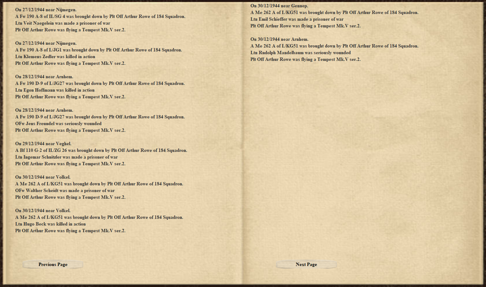 justin_z3r0 Posted August 22, 2021 Posted August 22, 2021 (edited) On 8/21/2021 at 2:54 PM, justin_z3r0 said: The squadron had moved to Schindel on Dec 29th. This airfeild only had an East West Runway which presented a problem for take off and landing n Southerly Winds. On the 29th, a flight of 4 went up to sweep the area near Gorinchem. Low Cloud at about 4000ft, and a strong South Wind. The flight lined up on the East bound runway planning to take of with a Rear quartering wind of +15mph. Flight lead managed to get off the ground - full left Rudder but still veering hard to the right narily missing the control tower whilst taking off in the grass. Art (number 2) saw this and decided to proceed more cautiously while applying a little left brake. Still the tempest swung to the right. Art applied the brakes, planning to line up and try again, but by this time #3 thought he should proceed full throttle. He followed the flight leads path and made it up (on the wrong side of the control tower halfway down the strip) just as the flight leader had. #4 was the rookie and followed suit but was ill prepared for this with only ~3 hrs on Tempests. He plowed into the control tower probably going 90-100mph. Art witnessed it all while stopped on the runway. What a disaster! After lining up again - Art made it up with much difficulty. He found the flight circling above the field and joined in. Now they were just 3. About 5 miles North of the field the flight lead spotted an Me 110 dropping below the cloud base head on. The leader opened fire and must've managed to kill the pilot as the Me 110 Launched up into the cloud with dark smoke trailing behind, only to complete its loop below the cloud in a sharp dive towards the ground. This is when another was seen dropping below the cloud. "This one is mine" Art Muttered to himself positioning himself on the tail of the twin engine. He persued it up into the cloud keeping close so as not to lose him. Just as he was disappearing into the cloud, Art fired off a long burst in the 110s direction. He levelled out and descended back below the cloud thinking it had escaped. But then... a dark smoke trail came beneath the cloud. It was on fire. "I must've hit it". Landing back at Schindle was a treat. 3 Attempts to line up the runway and land. With ample crosswind input ,the third attempt ended up being rather smooth though. Edited August 22, 2021 by justin_z3r0 2
