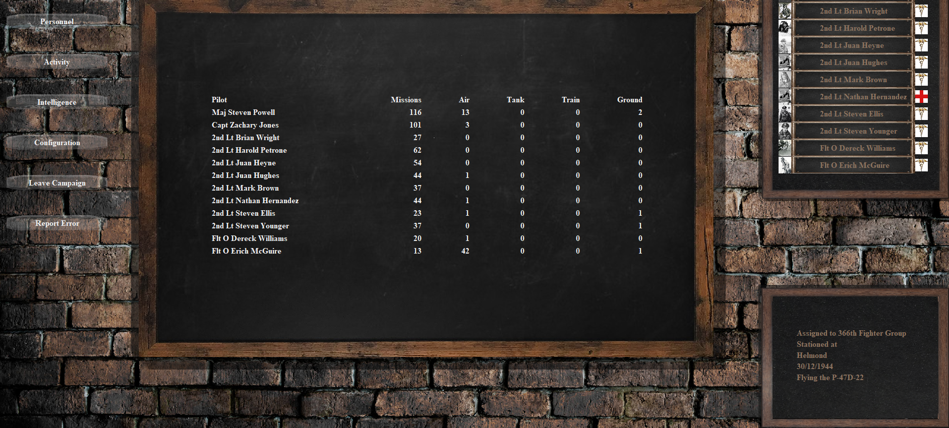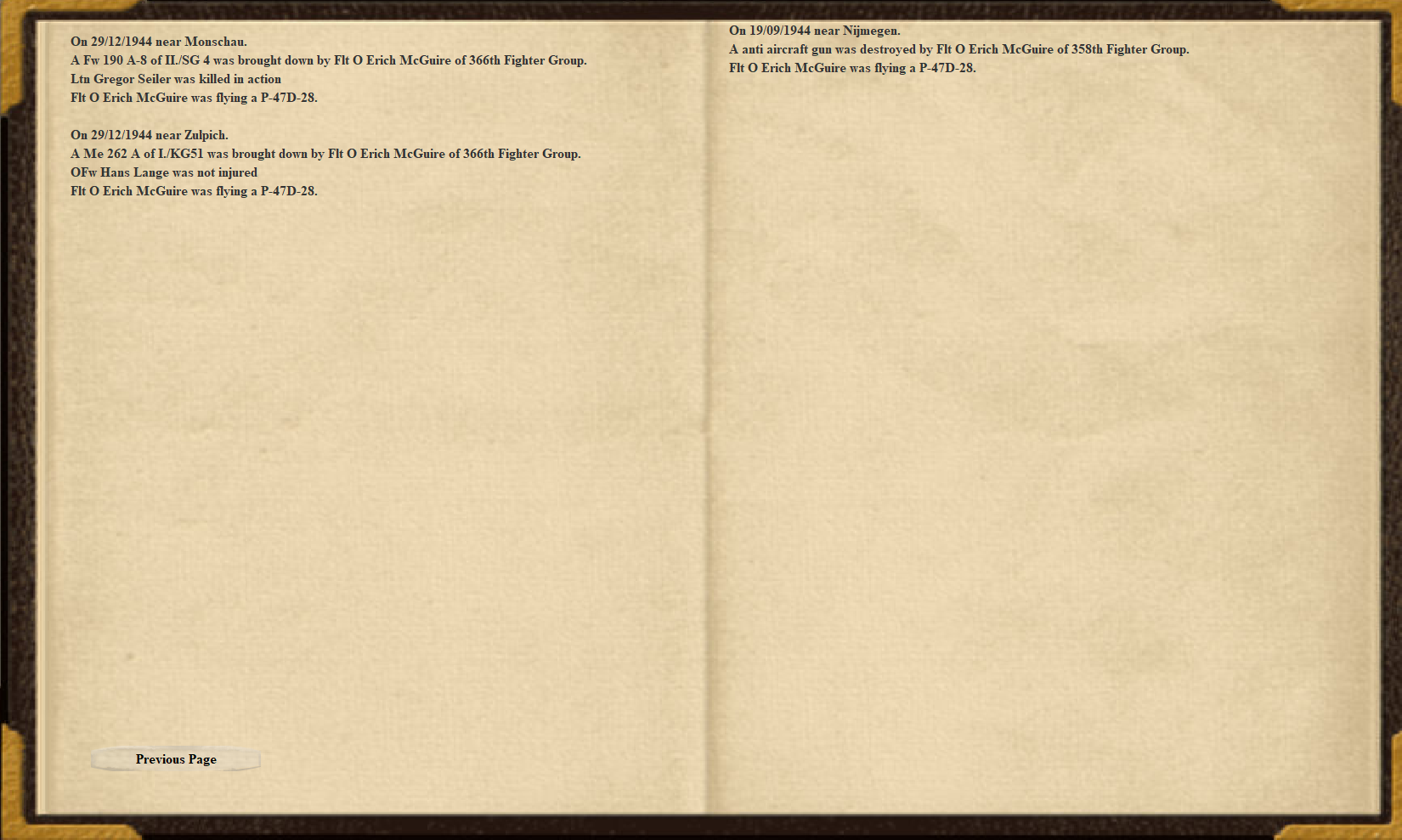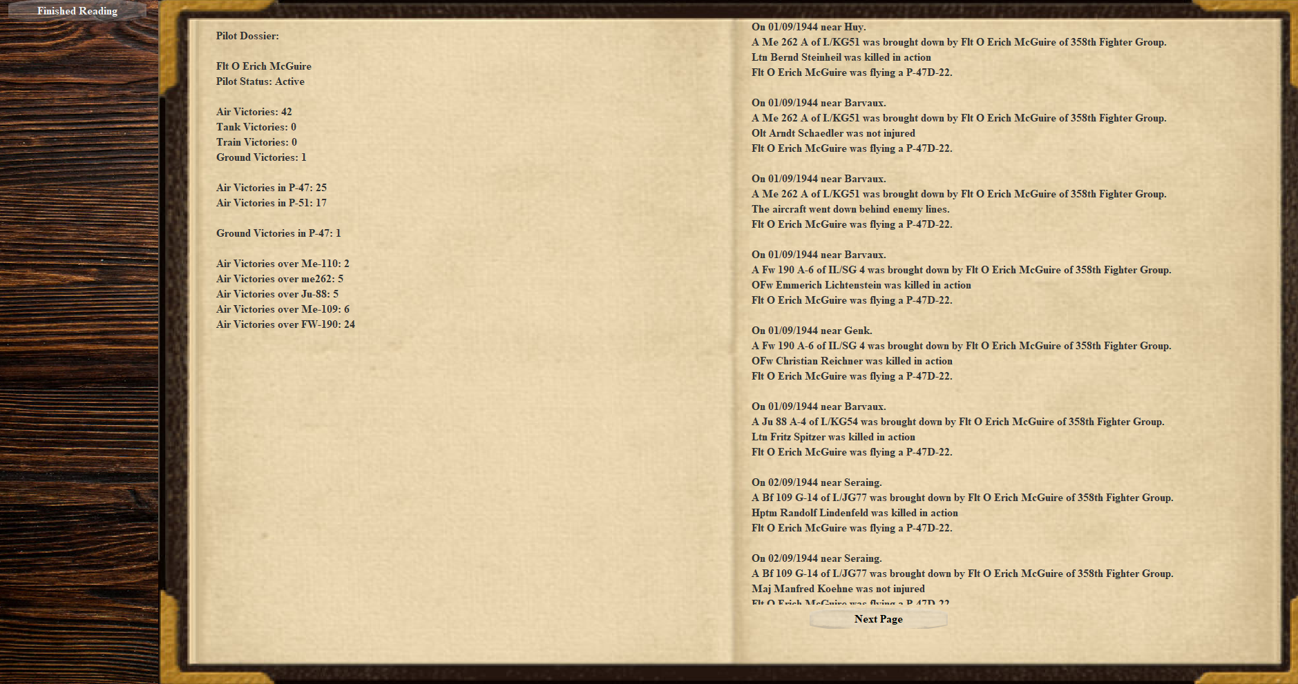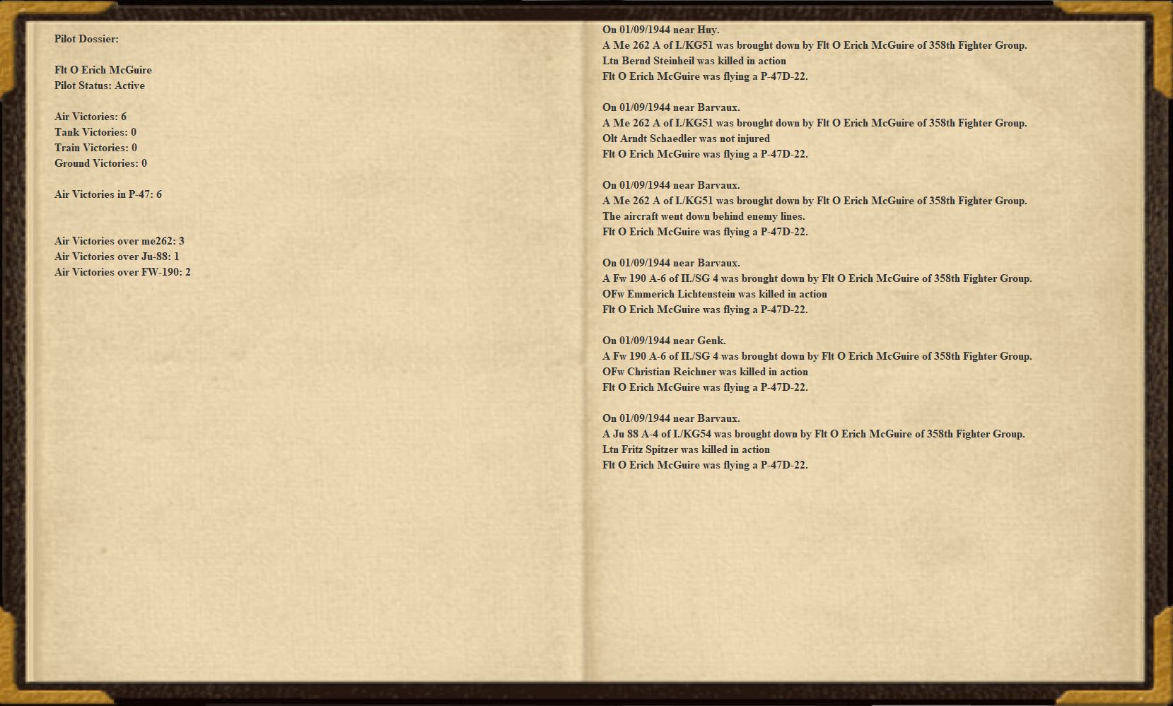 oFlyingDutchman Posted October 11, 2021 Posted October 11, 2021 (edited) Erich McGuire just shot down his 30th foe. He briefly switched over to another division to test the P51's and up the moral of the squadron that had a few losses, and to get away from his mad commander that sent him not once, but twice to patrol over enemy airfield, where, both times, we has the only one to get over the patrol point without getting shot by AAA. He's back at the P-47, but at a diferent squadron. Words are that his tour over Europe is almost over and he will be able to go back to America and train the trops over there that are going to be sent to the front, just as he was a few months prior. Edited October 11, 2021 by oFlyingDutchman wrong name LOL 1
