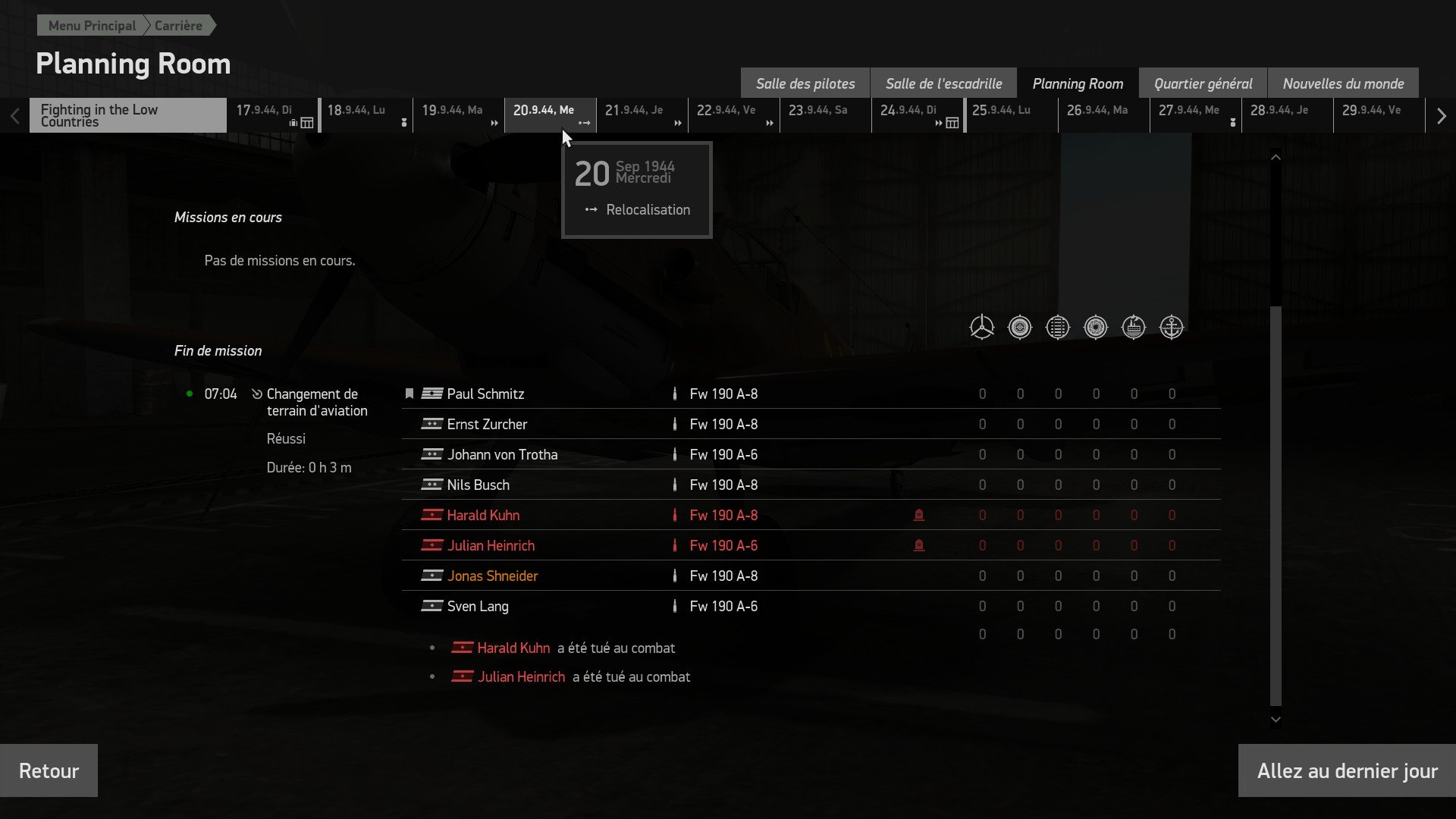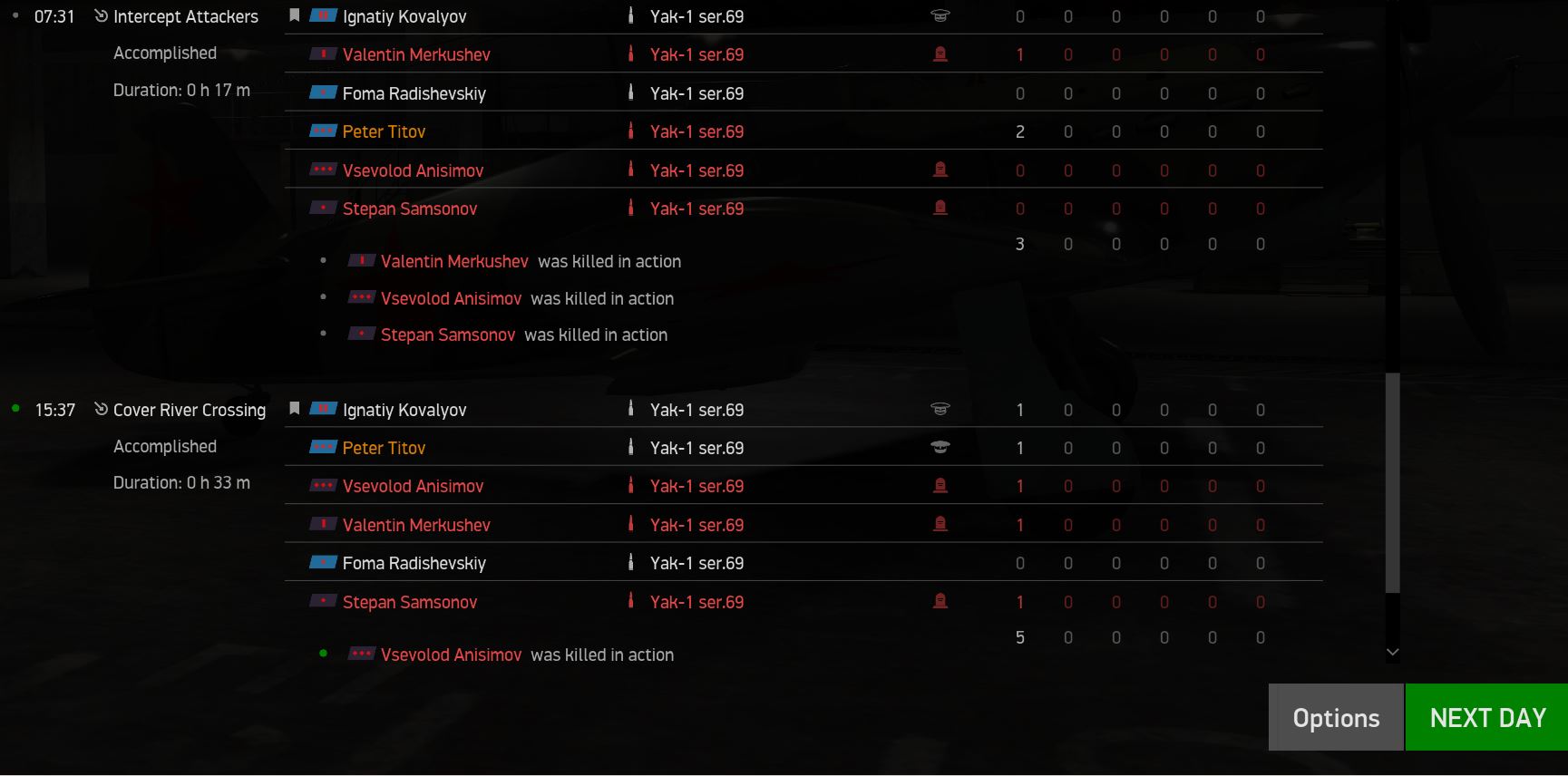 Noisemaker Posted September 2, 2022 Posted September 2, 2022 Strange one I had the other day: The flying dead As you can see, on the first mission of the day 3 pilots were killed, yet still on the roster for the second mission of the day: I flew the mission with my dead comrades (who actually managed to kill E/A!), but despite not being shot down, they remained dead, losing their aircraft in the process. The flying dead.zip 1