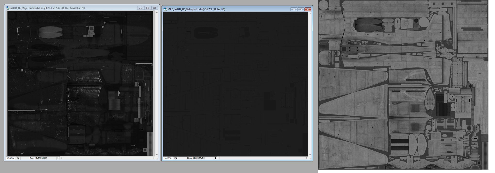 SR603-Flowbee Posted September 14, 2021 Author Posted September 14, 2021 (edited) "You make great skins, but it's a shame those are too shiny." I think the in game alphas are miles off. The first thing I do is to bring things inline where I believe it to be correct. The one thing I am confident of is that I can control the alpha just as I want. I am totally puzzled by your comment Maybe something got lost in translation. If I thought the skin was too shiny I would have adjusted it. You are however perfectly entitled to have a personal preference. If you think it is wrong just adjust it until you think it is right for you. I make my skins with a balance that I like. The one thing I do prefer is metal that is shinier than aluminium which tends to be dull unless polished. I think this improves the skin and gives it a paint over metal look. That is my personal preference. I think I might have misread your comment as it makes no sense. Your English is better than my French so that isn’t a criticism. Even the screenshot shows that I have range of reflection from shiny metal to matte paint and dirt. Maybe you could clarify what you actually mean. Are you perhaps talking about the wet look gloss in game skins when you refer to ‘those’ skins. Like I said I am puzzled. Here are 3 alphas for a Stuka. Mine is on the left, yours is in the centre and the ingame alpha on the right. I chose these because it is one of your latest skins. Some of your earlier ones either had no alpha at all or were set to pure white which gives total matte for everything. The first thing that is noticeable is that the ingame alpha has lots of detail but in the game, because of the light grey colour, even the dirt will look shiny. All that detail will be lost in glare and reflection. Your Alpha has virtually no variance or detail. Because of the dark grey colour it will result in an overall matte finish. Finally my Alpha, although giving a matte paint finish, it also has details in it. Look close at the dirt and streaks they have variance between shades of grey that will stand out. Most noticeable are the light grey details as these will show the metal effects that I like. It seems to me that you are talking a good game but don't actually practice what you preach. Even your very latest skin has very little range in it other than matte and satin. If anyone is interested in controlling and using the features of the Alpha layer I would be happy to explain further so that we can all enjoy better skins. Making a good skin takes time. It isn't just a case of moving a slider to change the brightness. Every material has it's own amount of reflectivity and this creates contrast that lets the details become noticeable and this gives the skin life and not just colour. I know the profile isn’t great but it just happens to be the picture that got my interest. The profile isn’t wrong though as the tail construction on the G14 differed between aircraft as the Germans tried to standardise but failed. The b/W photos are not wrong that is why my skin is based on them and many other profiles online which show different opinions on the colours. I just try not to spam the post with every photo and profile I come across. This aircraft, because of the many photos, has been covered dozens of times. My favourite version is the one done by Pagani Zonda but I wanted to do my own impression working from the b/W photos. It is a pity Pagani Zonda doesn’t do more skins for this game as his use of colour is outstanding. Unfortunately he couldn’t get the Alpha layers working just right and went back to war thunder. Perhaps I will try to import one of his skins just to show what he does so well. Edited September 15, 2021 by SR603-Flowbee 1 2