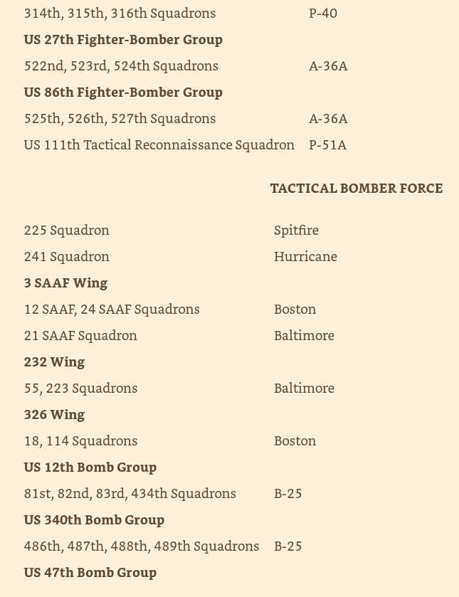 Avimimus Posted November 13, 2021 Posted November 13, 2021 (edited) 1 hour ago, sevenless said: Very different: Guest, Russell. Christopher Shores. A History of the Mediterranean Air War, 1940-1945. Volume 4: Sicily and Italy to the fall of Rome 14 May, 1943 – 5 June, 1944 (S.152). Grub Street. Kindle version Thank you sir! I think there is actually considerable overlap: Hurricane II fighter bombers Spit V Bostons (A-20) Early Mustangs (Note: I believe the A-36A and P-51A are the first Allison engined variants - but otherwise the P-51A is very similar to the Mustang Mk.I) Beaufighters and Wellington bombers were still operating in the 1942 Channel theatre, even if they weren't used at Dieppe. The big differences are the presence of Italian aircraft, American bombers & Baltimores, and large numbers of P-40 variants. Also the absence of the Do-217 in Sicily, and the absence of early Spit IX and Typhoons (which were pretty peripheral to Dieppe anyway). Edited November 13, 2021 by Avimimus 1