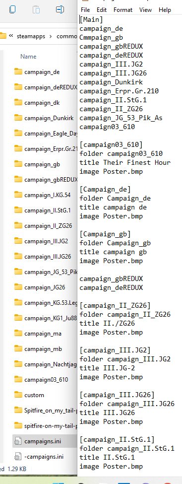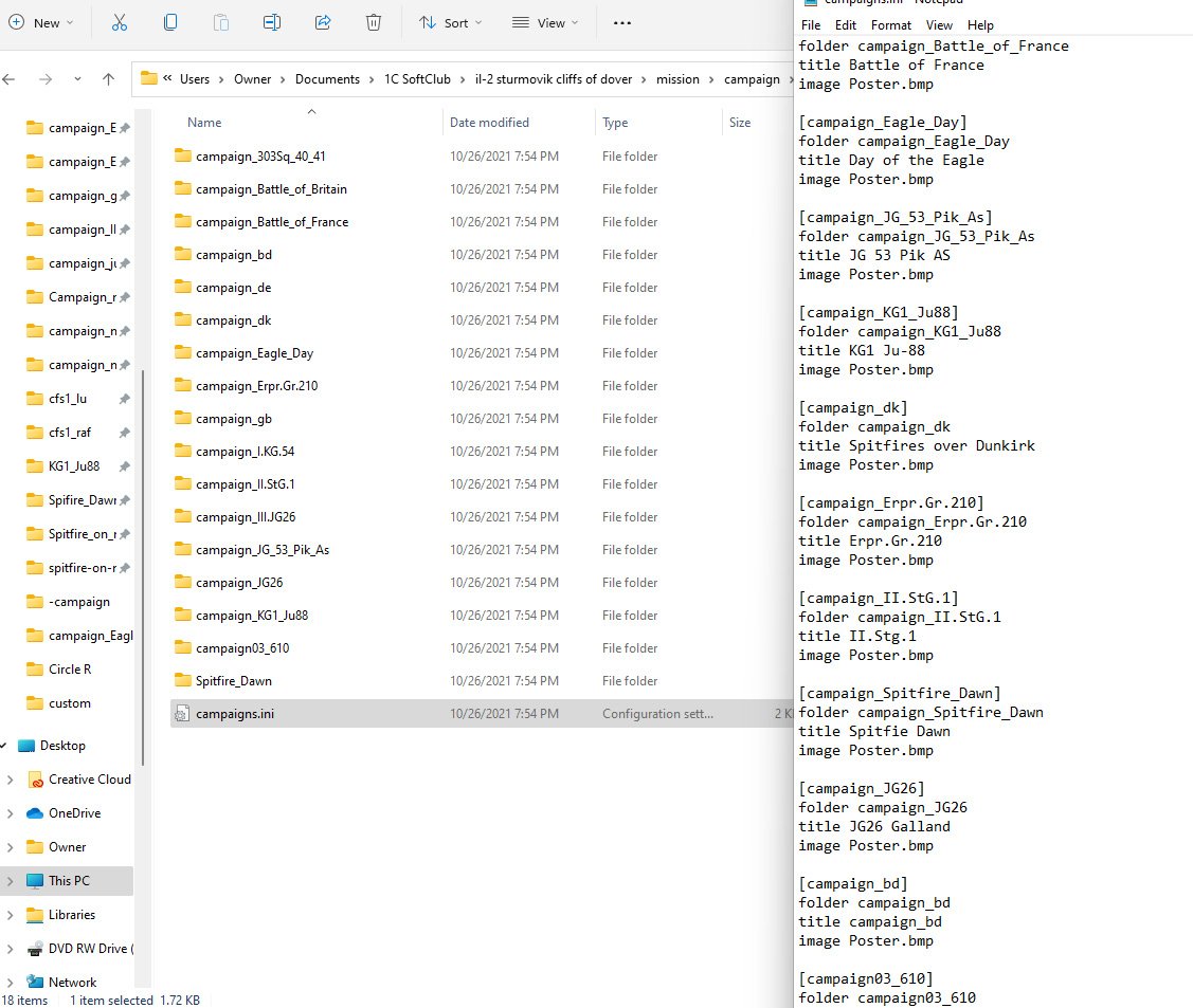 Blitzen Posted October 26, 2021 Posted October 26, 2021 Recently all my third party campaigns went AWOL. I still have stock campaigns so I figured that the campaign.ini file had changed with the fix,& yes, it had.So I went in and added ( as I have done before from a saved version of the ini file,) all the missing entries in the hopefully correct order in both the Steam/CloD/ Parts/ BoB/Mission/ Campaign folder. After this didn't solve the problem I did the same in the Documents/1C SoftClub /Mission folder.Still no joy. There was one more ( probably misplaced ,and probably unnecessary folder )in Steam..../Clod/Mission Mission/ Campaign. Still the only things that show up are stock campaigns. I've reinstalled the game & redone all of the above,still no luck I'm at my wits end...what is the proper way to get everything working again????