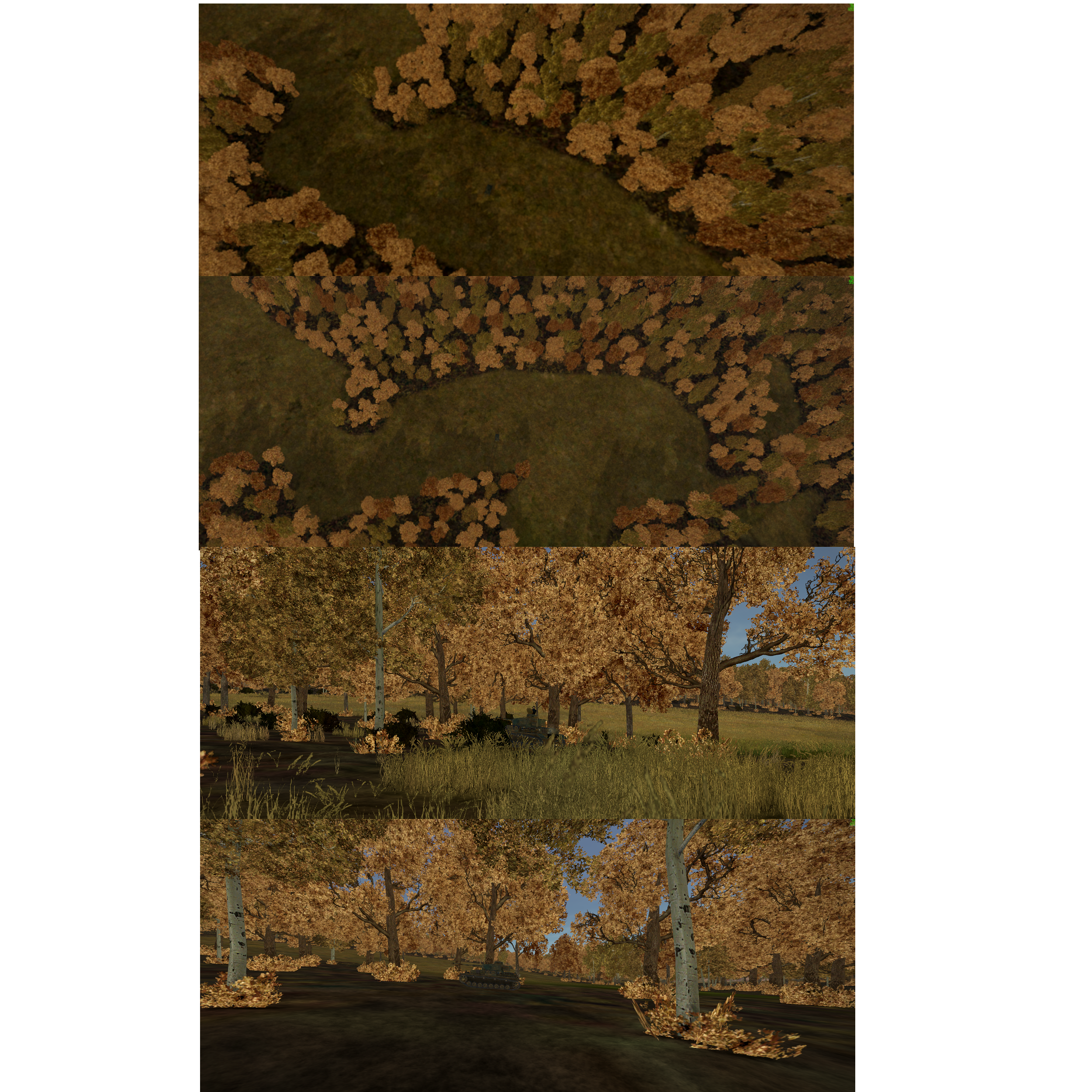 SCG_Neun Posted November 6, 2021 Posted November 6, 2021 (edited) I've looked at it from the air and the grass detail settings really don't have much of an effect on concealment at least from the sky looking down. On the ground there is a big difference if rendered under normal combat distances. Also under the same lighting conditions camo plays a significant role in concealment which I've noticed has improved over time with the updates. So just my quick observations.... from the air, concealment without the aid of AI gunners needs slow movement under heavy foliage conditions with good generic camo settings. In the open, or with sparse foliage, especially moving....you don't stand much of a chance. top "no grass" settings, 2nd down, ultra settings, 3rd ultra grass settings and bottom, no grass settings. Edited November 6, 2021 by SCG_Neun