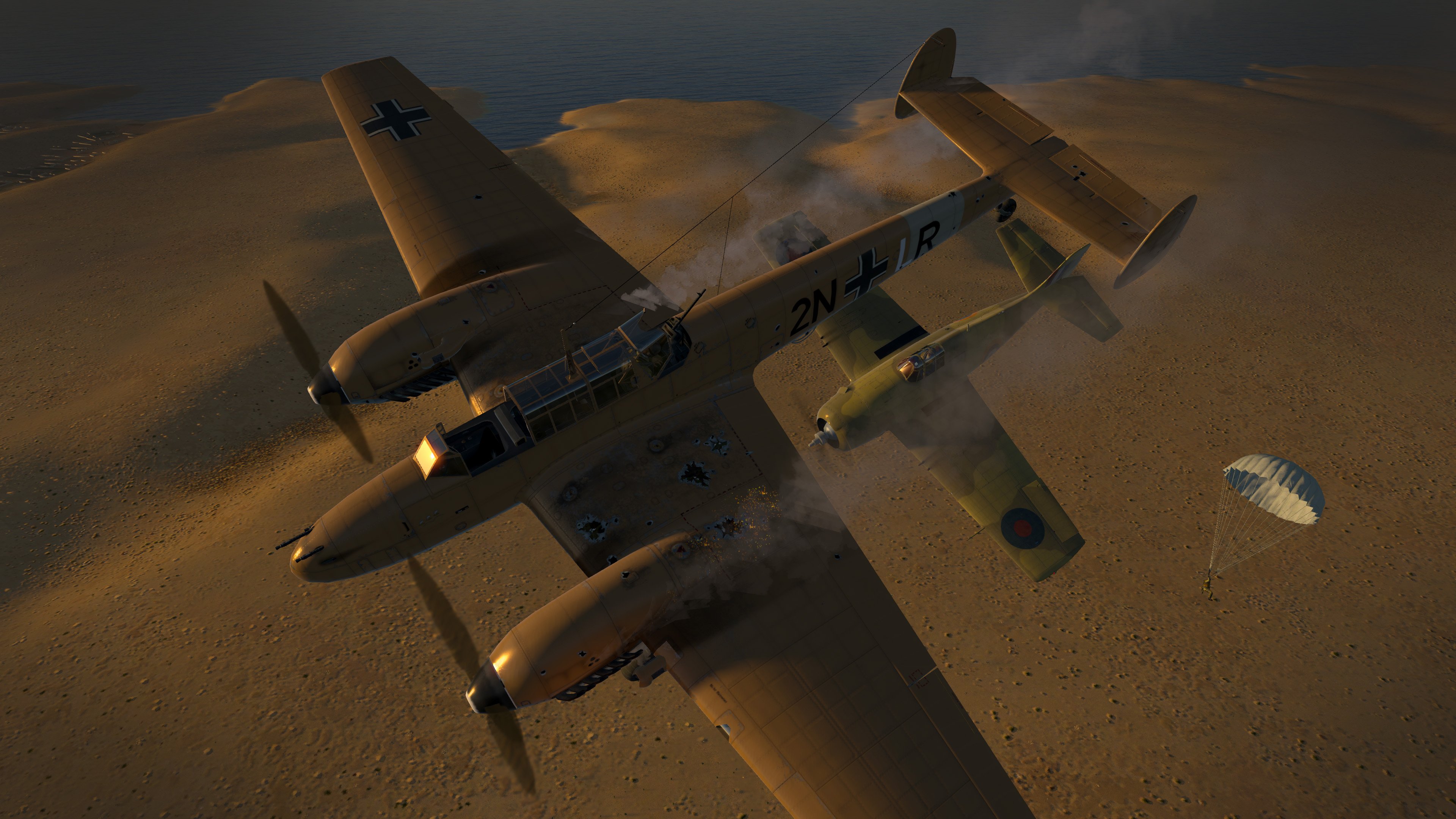Mysticpuma Posted December 6, 2021 Posted December 6, 2021 Out and about in the Martlet over the desert of Tobruk, I find a 110 idling along. A few bursts of the .50-cal and the glorious damage model shows itself as the hydraulic pressure drops and one undercarriage wheel lowers down. Quite incredible, even today to see it brings a smile to the face. 12
