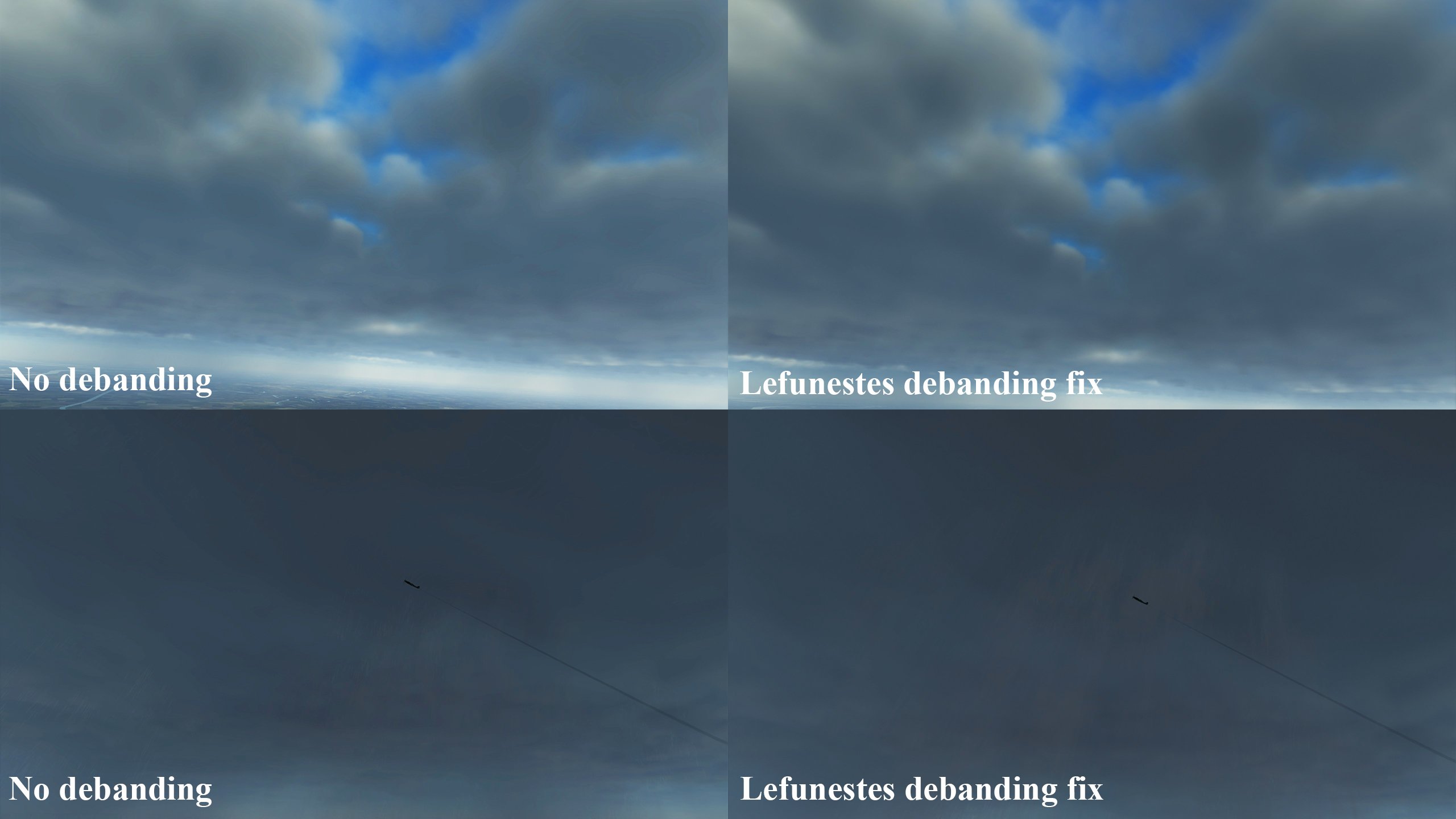 C6_lefuneste Posted December 18, 2021 Posted December 18, 2021 1 hour ago, coconut said: To me it looks like clouds are rendered using a 16-bit buffer, instead of 24-bit. I wonder if it has to be this way. The memory saving are quite negligible, but maybe it's needed for performance reasons? I'm not sure. For the moon "halo", the sampling of the texture is giving a non banded display, but very bright. Then additional process lower the brightness and introduce banding. Putting some dithering on it seems to solve the issue.