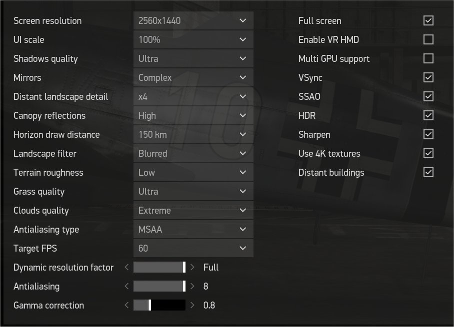 JG7_RudeRaptor Posted December 12, 2021 Posted December 12, 2021 (edited) How about best settings for quality? I found all type of post about running smooth play but nothing about quality. I'm running RTX 2070 Ultra i9900k (5.01 MHz) 12gb memory res 2560x1440 Asus XG32V Nvidia control panel with Nvidia Inspector Runs flawless with ultra settings never dropping under 59 fps But yet distance view looks like antialiasing not doing it's job? Roads and runways are looking jagged and even some non smooth edges. I have all Antialiasing set to application controlled in Nvidia control panel and Inspector graphics] 3dhud = 0 adapter = 0 bloom_enable = 1 canopy_ref = 2 desktop_center = 1 detail_rt_res = 4096 draw_distance = 1.00000 far_blocks = 1 fps_counter = 0 fps_limit = 60 full_height = 1440 full_width = 2560 fullscreen = 1 gamma = 0.80000 grass_distance = 300.00000 hdr_enable = 1 land_anisotropy = 2 land_detail = 1 land_tex_lods = 3 max_cache_res = 1 max_clouds_quality = 3 mgpu_compatible = 0 mirrors = 3 msaa = 1 multisampling = 3 or_ca = 0.00000 or_dummy = 0 or_enable = 0 post_sharpen = 1 preset = 3 prop_blur_max_rpm_for_vr = 155 rescale_target = 1.00000 shadows_quality = 4 ssao_enable = 1 vsync = 1 Edited December 12, 2021 by JG7_RudeRaptor 1