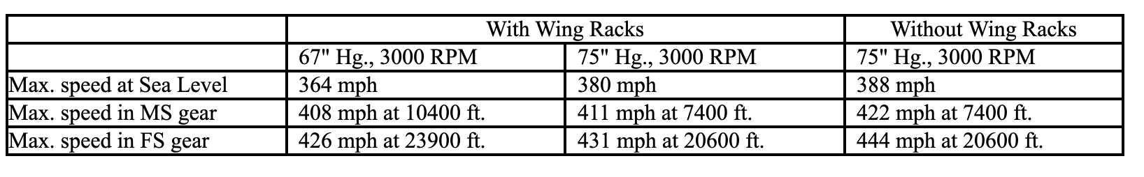 ACG_Cass Posted January 4, 2022 Posted January 4, 2022 7 hours ago, CUJO_1970 said: B. NORTH AMERICAN 4-25-44 V-1650-7 67" HGThe P-51B-15 airplane, AAF No. 43-24777 361 MPH (These tests were also with gun racks removed) Only the 75" was run without wing racks - http://www.wwiiaircraftperformance.org/mustang/p-51b-24771-level-blue.jpg "It will be noted that all tests were run with the wing racks installed. Speeds would be approximately 12 mph faster with the wing racks removed as shown by the dash line curve on the Speed vs Altitude Curve" Also shows 364, not 361. http://www.wwiiaircraftperformance.org/mustang/P-51B_24777_Speed_Altitude.jpg Here you have 362, again with wing racks so that would need to be corrected. And here you have the engineerings divisions charting of the flight test data that shows it hitting 385mph at 67" http://www.wwiiaircraftperformance.org/mustang/p-51b-engdiv-na-flighttestdata.jpg Also here's a D with wing racks hitting 375mph at 67" http://www.wwiiaircraftperformance.org/mustang/p51d-15342.html From that you can see the speed increases (IAS, TAS would be even more) available from the oil and coolant shutter positions at 15,000ft 46" 2700rpm. These gains being higher at sea level running at full speed seems possible. http://www.wwiiaircraftperformance.org/mustang/P-51D_15342_Shutter_Calibrations.jpg I really don't feel like the achievable speeds are that unrealistic based on all the data we have on the plane. 3