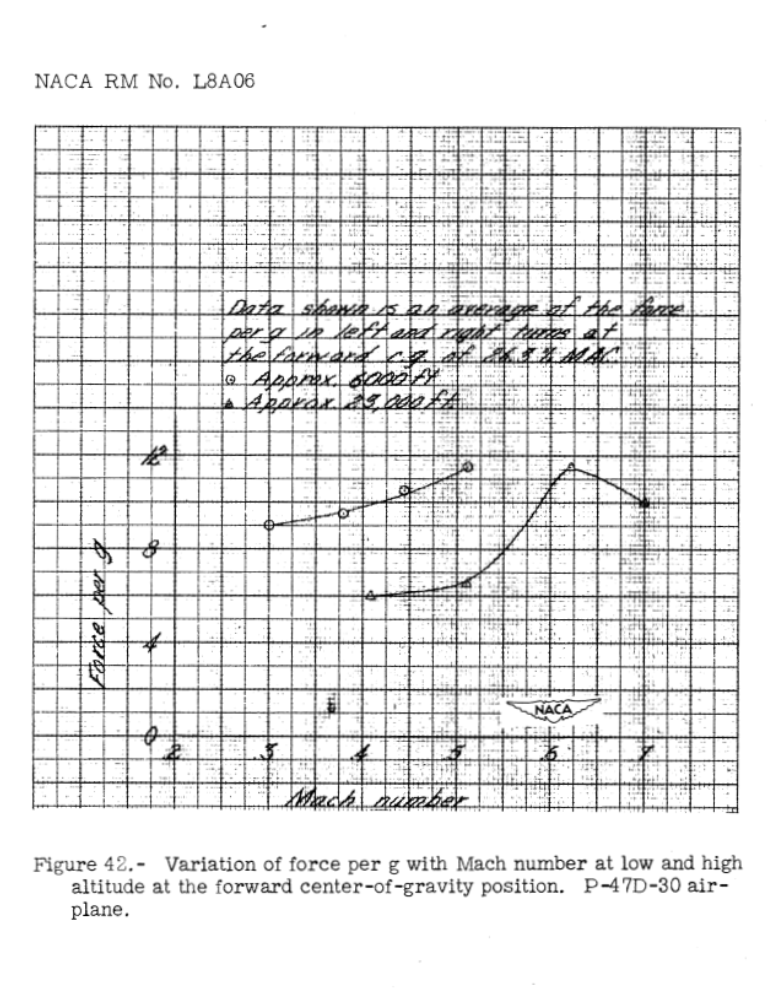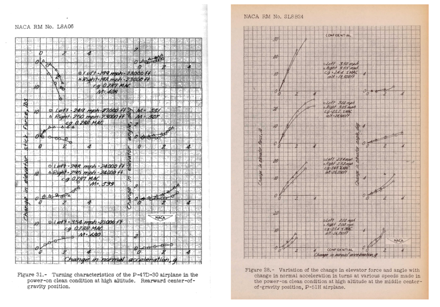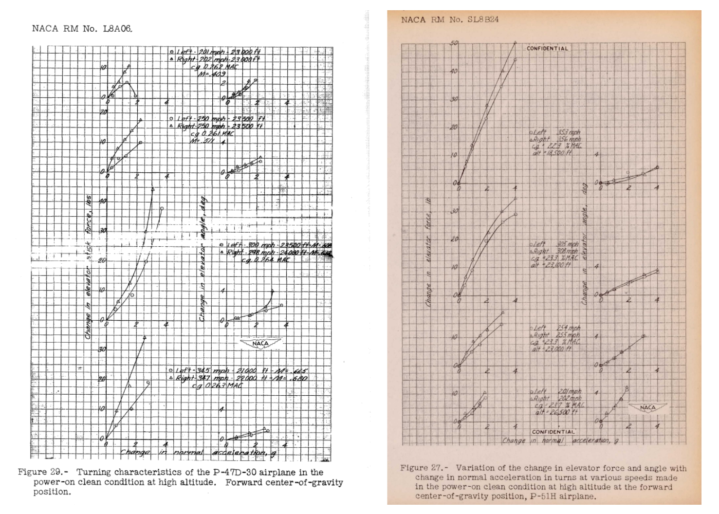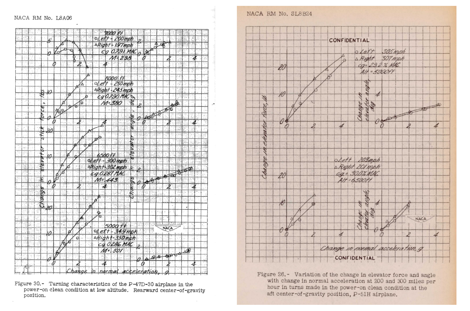 ACG_Cass Posted January 22, 2022 Posted January 22, 2022 (edited) It appears as though the elevator effectiveness and stick forces for the P47 at speeds below 350 mph (airspeed) are too low and high respectively. There are two similar tests on longitudinal stability and stalling characteristics of the P-51H and the P-47D30. The P-51H had a fair few changes but was lighter and used an almost identical elevator configuration. I think it's safe to assume the forces were similar to that seen on the D. https://ntrs.nasa.gov/api/citations/20050028754/downloads/20050028754.pdf - Measurements of the Longitudinal Stability and Control and Stalling Characteristics of a North American P-51H Airplane (AAF No. 4-64164) https://ntrs.nasa.gov/api/citations/20090022749/downloads/20090022749.pdf - Flight Measurements of Flying Qualities of a P-47D-30 Airplane (AAF No. 43-3441) to Determine Longitudinal Stability and Control and Stalling Characteristics Conditions: Forward Centre of Gravity, low altitude: Forward centre of gravity, high altitude Read center of Gravity, low altitude Rear centre of gravity, high altitude (P-51 is a middle centre of gravity configuration) Forces comparison at different center of gravity configurations (different speeds, but a comparison and good data) P-47 Data on force per g vs mach: Stick free comparison at low alt: stick free comparison at high alt: There are stick fixed tests for the P-51H that show a reduction in force, but these were not shown for the P47 unfortunately. Edited January 24, 2022 by ACG_Cass 6