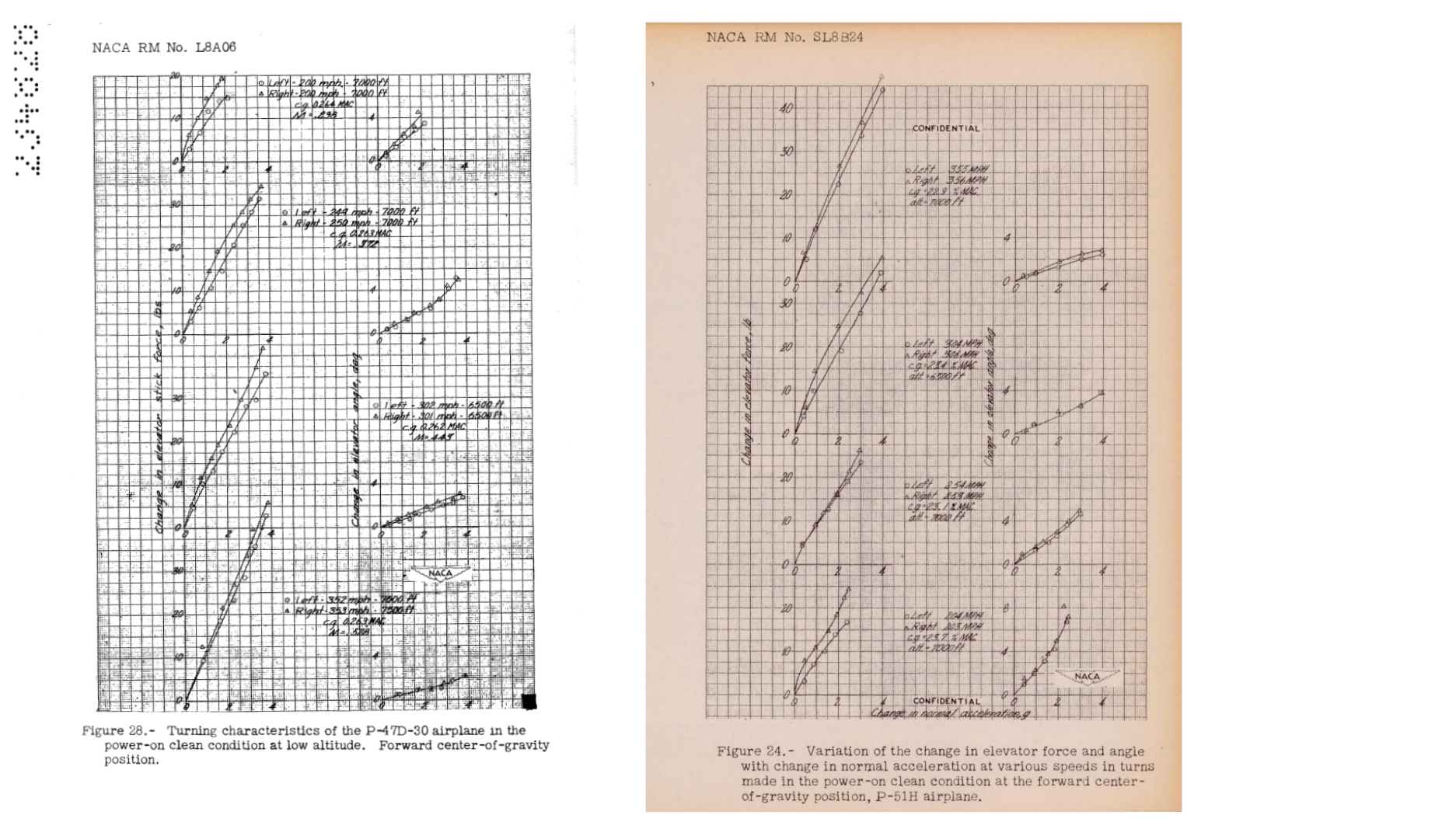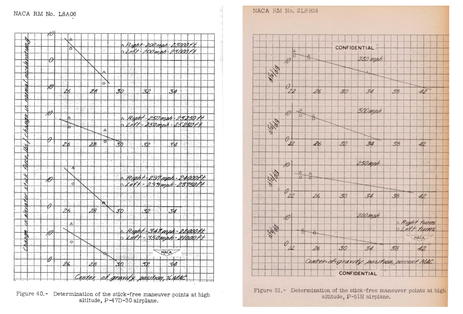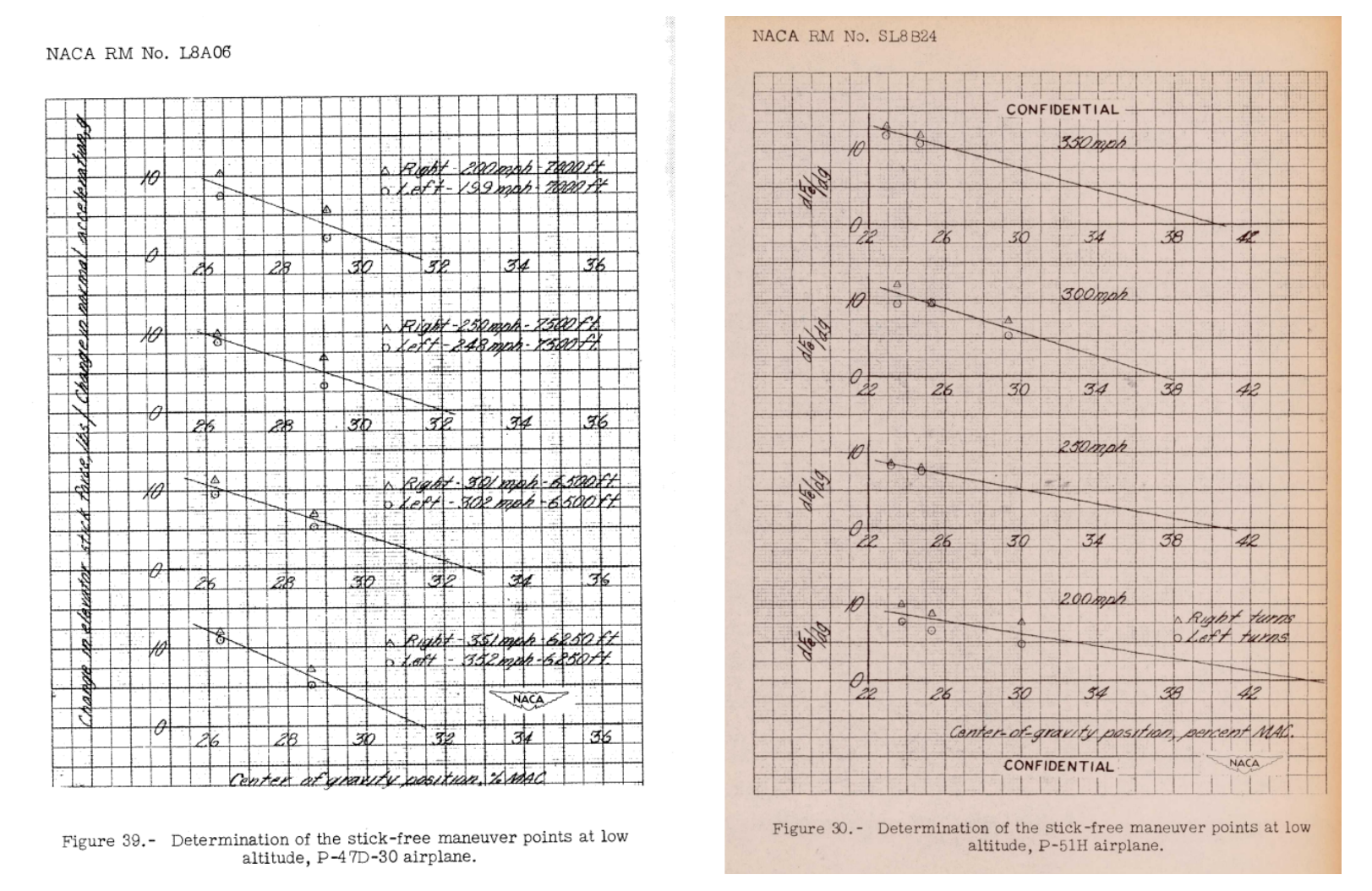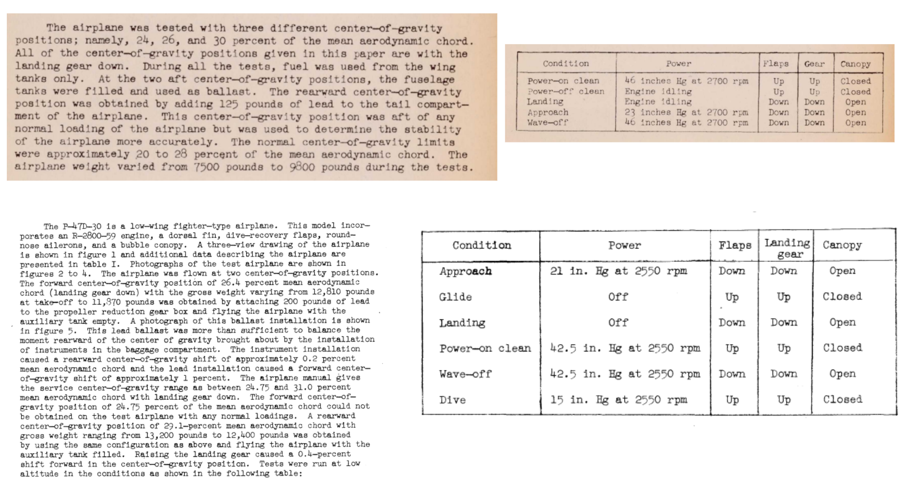 ACG_Cass Posted January 22, 2022 Posted January 22, 2022 (edited) It appears as though the elevator effectiveness and stick forces for the P47 at speeds below 350 mph (airspeed) are too low and high respectively. There are two similar tests on longitudinal stability and stalling characteristics of the P-51H and the P-47D30. The P-51H had a fair few changes but was lighter and used an almost identical elevator configuration. I think it's safe to assume the forces were similar to that seen on the D. https://ntrs.nasa.gov/api/citations/20050028754/downloads/20050028754.pdf - Measurements of the Longitudinal Stability and Control and Stalling Characteristics of a North American P-51H Airplane (AAF No. 4-64164) https://ntrs.nasa.gov/api/citations/20090022749/downloads/20090022749.pdf - Flight Measurements of Flying Qualities of a P-47D-30 Airplane (AAF No. 43-3441) to Determine Longitudinal Stability and Control and Stalling Characteristics Conditions: Forward Centre of Gravity, low altitude: Forward centre of gravity, high altitude Read center of Gravity, low altitude Rear centre of gravity, high altitude (P-51 is a middle centre of gravity configuration) Forces comparison at different center of gravity configurations (different speeds, but a comparison and good data) P-47 Data on force per g vs mach: Stick free comparison at low alt: stick free comparison at high alt: There are stick fixed tests for the P-51H that show a reduction in force, but these were not shown for the P47 unfortunately. Edited January 24, 2022 by ACG_Cass 6