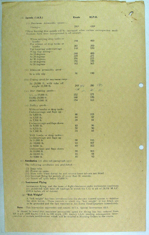 CUJO_1970 Posted February 13, 2022 Posted February 13, 2022 Any fighter aircraft of the era could run into problems most likely if you treat it wrong in a high speed dive. The P-51 experienced structural failures to varying degrees throughout the war. These failures persisted in various forms after the uplock issue was apparently corrected and lead to the P-51D being first redlined at 505 mph and then further reduced to 450 mph in the appendix to the P-51 POH. This one issued dated May 8th 1945: Structural failures also centered around the tail plane were experienced in both USAAF and RAF P-51D aircraft: Willard G. Gillette was testing P-51 Mustang 44-13372 on 10 August 1944, this aircraft crashed after it suffered a structural failure in a dive during a test flight from Debden. It lost its ammunition tray covers, then went out of control when its tail snapped off. Gillette baled out and landed on the cricket field in Haverhill Castle Camp. RAF structural issues with Mustangs led to a study by the R.A.E. in 1945, in part centered around tail plane fractures. This is one of the RAF 126th FS Mustangs (See note): 2 1