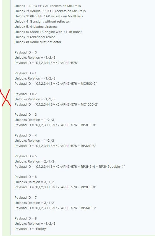 JimTM Posted February 14, 2022 Posted February 14, 2022 (edited) Nice explanation Sketch. For DD-Friar's case (no 500s or 1000s), I think the Available Payloads has to change to 0/1/2/3/10/11/12/13/14/15 to lockout payload 4 and 5 (500s), and payload 6, 7, and 8 (1000s). The payload numbers are from Han's list, not the in-game numbers. Note that the payload numbers you see in the game are one above the numbers that you specify in Available Payloads, for example, the 500s show 5 and 6 in the game, but you specify 4 and 5 in Available Payloads to allow the 500s. Edited February 14, 2022 by JimTM 1