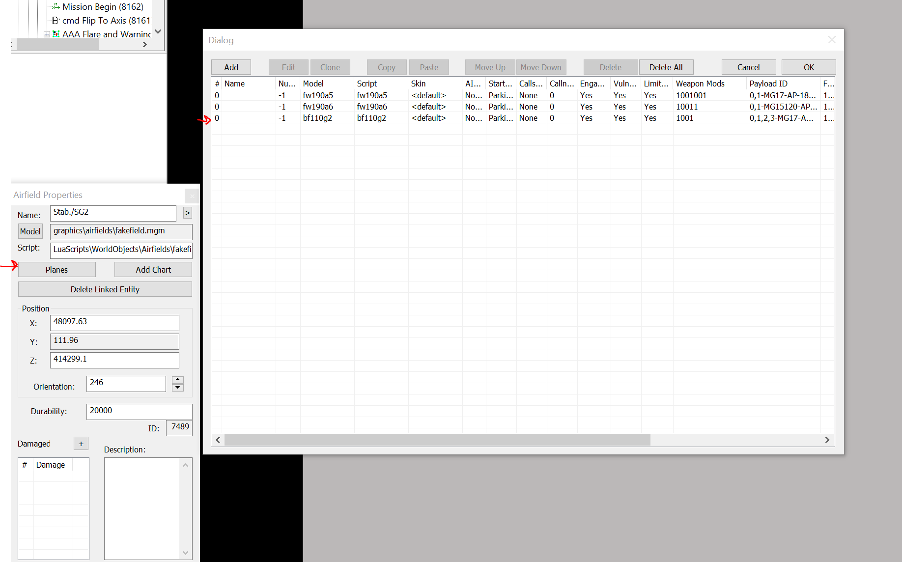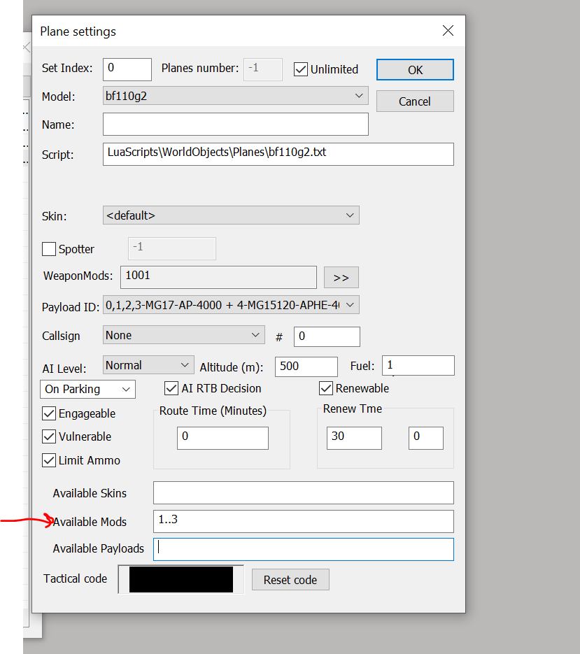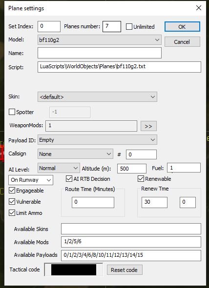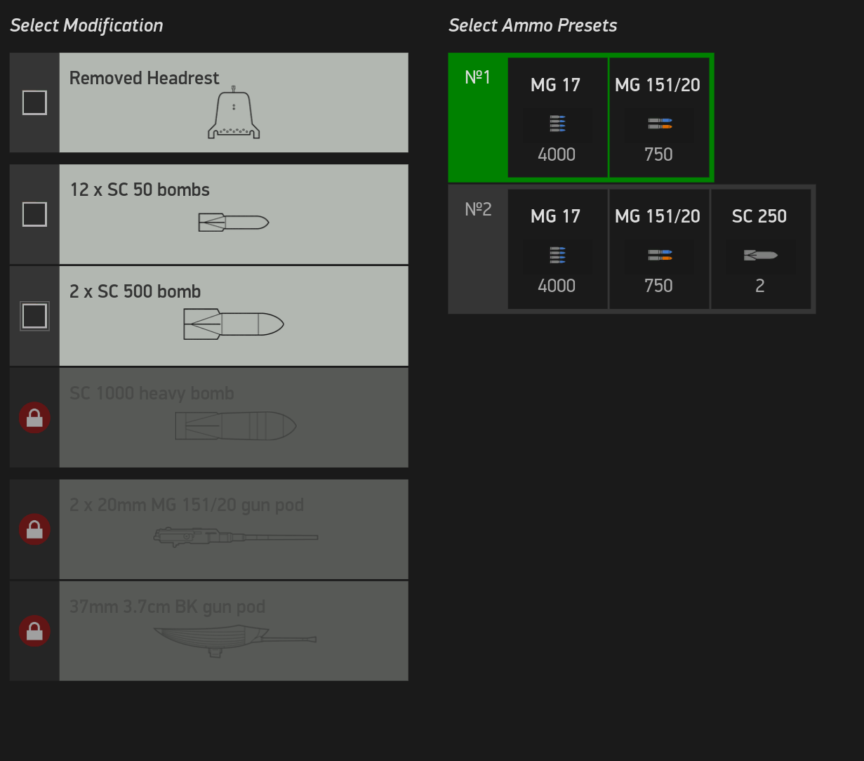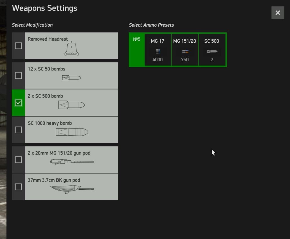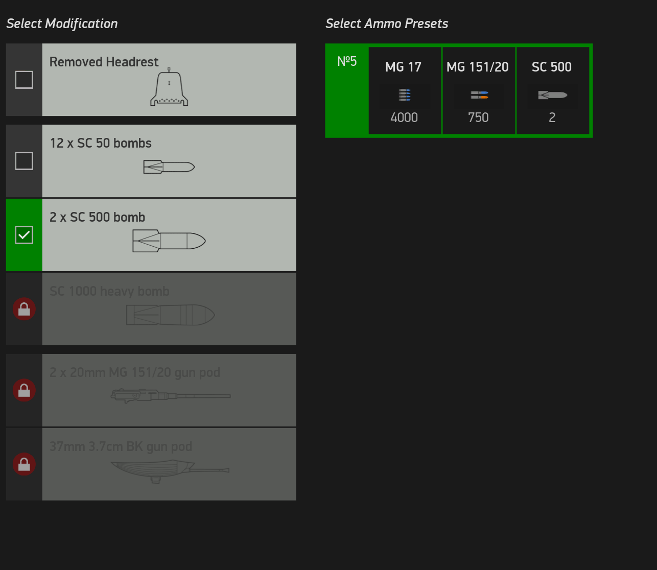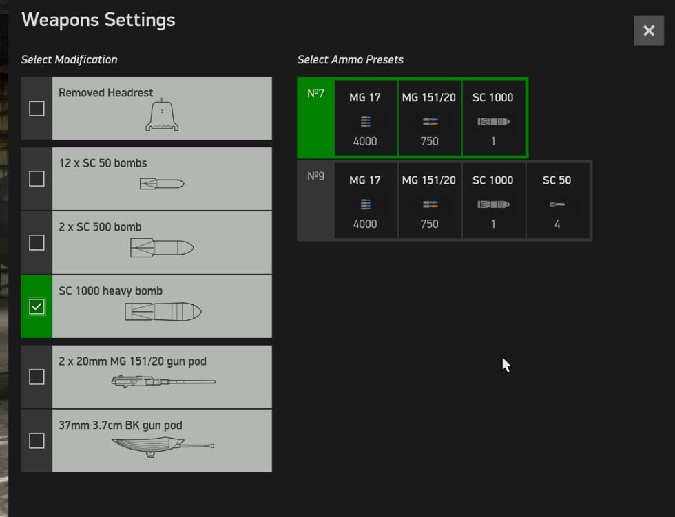 Sketch Posted February 14, 2022 Posted February 14, 2022 (edited) First, use this link to determine what you want locked and what you want unlocked. Next, make sure your SDS file (the file that configures your server's settings) have modifications and payloads locked. You can find an example SDS file in your multiplayer folder. C:/.../1C Game Studios/IL-2 Sturmovik Great Battles/data/Multiplayer/Dogfight_Complex_Example.sds Now to lock the modifications and payloads, go to the mission editor -> airfield properties -> planes and select the plane you wish to modify. Inside the Plane Settings, there is a WeaponsMods button. Click that. Any mods you give the player inside this menu will overwrite anything you put inside Available Mods text box and Available Payloads text box. In my picture below, I am giving the player access to 500kg bombs - even if I don't give them access in the mods/payloads blocks. Hit okay, and let's fill out the Available Mods block. Using Han's guide, we can see that there's 6 available unlocks. We want to limit the 1000kg, the gun pods, and the BK37 cannon. So our Available Mods list should look like this: Next we have to really look over the payloads, and figure out which payloads (based on our modifications) we want to allow the player to have. In my case, I don't want the player to have access to the 50kg wing bomb payloads when they select either the 250kg mod or the 500kg mod. In the image below, I have checked the payloads that I want, and X'd the payloads I do not want; which are payload ids 0, 1, 3, and 4. So I can fill in the Available Payloads block like so: NOTE: Adding two dots (periods) means the designation is between those ids. In my example above, the available mods are 1, 2, and 3 because I'm using two periods to designate between the two ids. NOTE: Adding a forward slash splits the designation ids. In my example above, the available payloads are 0, 1, 3, and 4 because I'm splitting the ids with a / Now when we go into the game, we will see that our Bf110G2 not only has locked 1000kg bombs, MG151s, and BK37 cannon, but the players can not take any wing mounted bombs either. Note: Because I assigned, through the WeaponMods menu, the 500kg bombs, this becomes the default loadout when the player selects the plane. The player can change the modifications that are available to them to see different payloads. In my image below, I deselected the 500kg bombs, and now I have access to 250kg bombs (again without wing mounted 50kg bombs). Hopefully this is helpful to you. Let me know if you need anything else! Good luck in your missions. Edited February 14, 2022 by Sketch Clarity 2