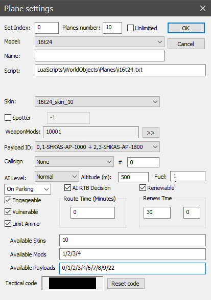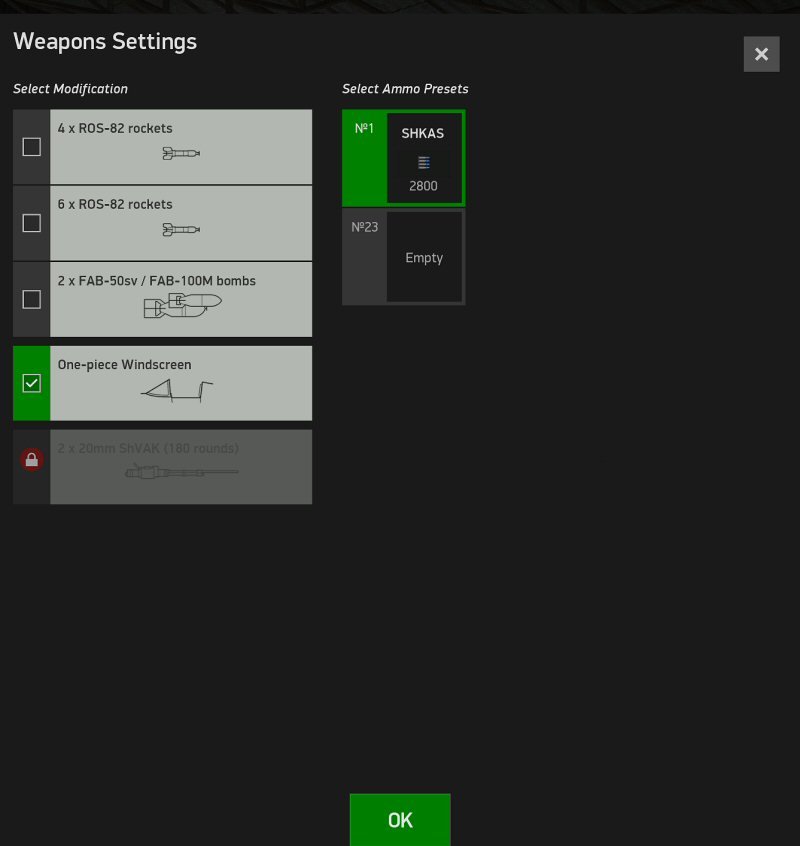 Beebop Posted February 22, 2022 Posted February 22, 2022 Using the above info and Hans list I am trying to make an I-16 that does not have the 2omm ShVAKS as an option. Below is the properties setup. By default the player has the SHKAS, the One Piece Windscreen and the Red Five skin. These options show as the defaults in the setup menu. However in the Modifications menu the 20mm ShVAKS are still available and are not greyed out as shown in the above examples. What am I doing wrong? TIA