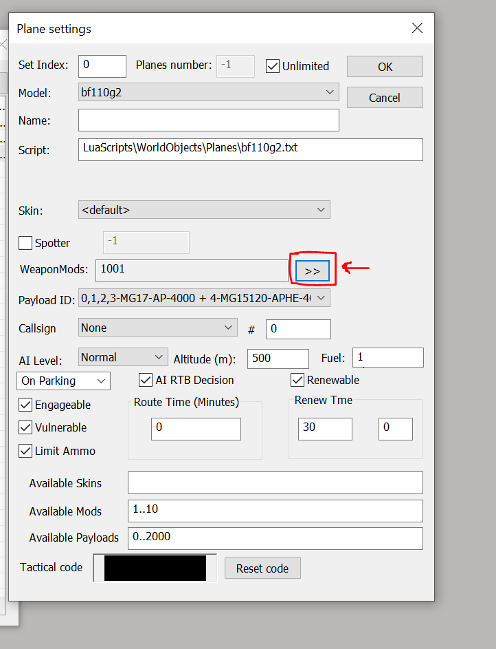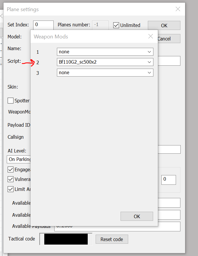 DD_Friar Posted February 14, 2022 Posted February 14, 2022 (edited) Salute I am currently trying to limit the loadouts for a BF110. I want to restrict the use of the 500 and 1000 sc bombs. I have looked at the threads but just can not get this plane to work. Is there anyone that knows and has successfully applied limited bomb load outs advice please. I have taken it that the the two mods I want to exclude are 3 and 4 and the load out numbers are 5,7 and 9 I have included below my settings. Please help a desperate mission builder ! Cheers Friar Edited February 17, 2022 by DD_Friar