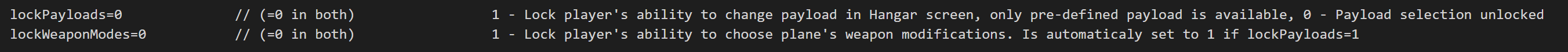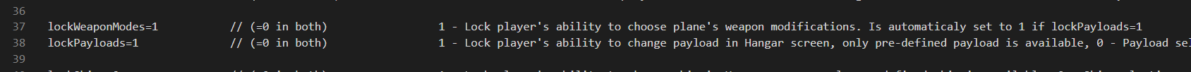Sketch Posted February 22, 2022 Posted February 22, 2022 I agree with @JimTM. It looks like your locked mods and payloads values are correct. However, in the SDS file (the configuration file for your server options) you must set both the weapon modes and payloads to be locked. You can find an example SDS file inside your multiplayer folder. These two options should be set to '1' to lock the modifications and payloads of playable airframes. If you're running the server through the game (instead of through DServer), then you need to check the locked modifications and locked payloads checkboxes. Here I've locked my modifications and payloads through the in-game server settings. Good luck, and if you any questions, let us know. 1