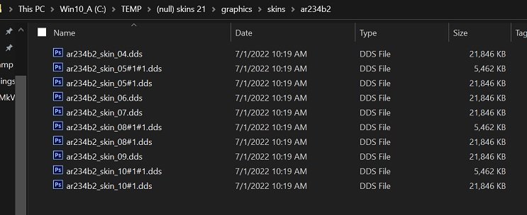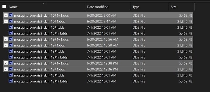 spudkopf Posted July 3, 2022 Author Posted July 3, 2022 On 7/2/2022 at 1:13 AM, jollyjack said: According Rap other symbols work too for the FIRST #, as in (name)&1.dds, and (name)&1#1.dds. In the game's default skins it seems always ...#1.dds and ...#1#1.dds inside the skins.GTP subfoldered files. ============================================================================================= Funny, in your zip the # appears "normal' when unpacked on my PC, the loose ones from your download have the wrong #. Set right by WinZIP? Might has to do with the ASCI coding on your Windows. (German language?) Both in the same folder, the greys are from the zip. I use Windows 10 Enterprise set to English, found out that using Dutch, even as second language always gives some errors at times. ====================================================================================== PS your ar234b2 skins posted don't have the secondary skins ... why some are called blank here i also don't get. Unpacked from the skins21.GTP they show up normal, no one called blank: I begin to think that these "blank' name versions are related to the IN-game renamed versions as seen in the viewer and game addressed somewhere else. They still show up there even with a disabled skins21.GTP file. In the planes11.GTP there are also ar234 and mosquito related dds files in textures You'll find dds files with the faux haken there ... example: ar234b2.dds, apparently a 4k skin Yes the Ar234B2 skins, like those skins for Mossie are differently named from what has been the norm until recently, to further complicate things not all the Ar234B2 skins are located in a either the SkinsXX.gtp or a PlanesXX.gtp, it took me a little while to sus' it out, but I eventually found them in the Camo1.gtp, along with some default B26 and Mossie skins. Cheers David 1
