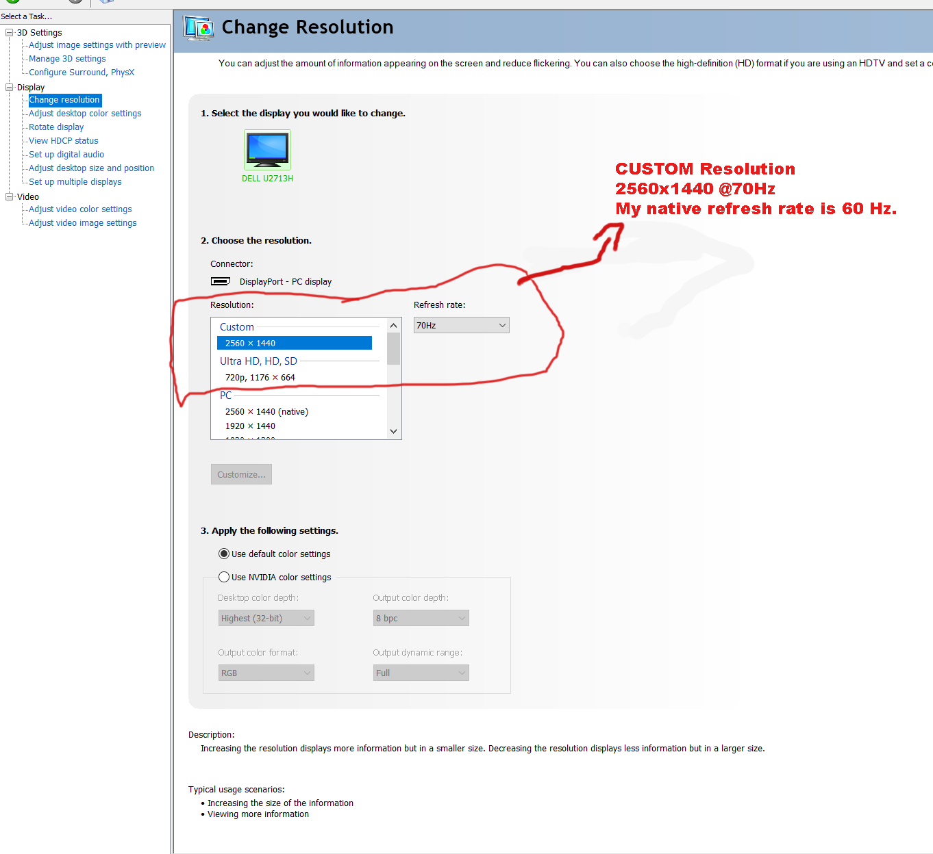 Jaws2002 Posted March 7, 2022 Posted March 7, 2022 (edited) Go to Nvidia control panel and click on the "Change resolution" tab. You can change the refresh rate of the monitor in there. First click on the refresh rate to see if you have 120Hz as option, If not, click on "customize" and create a new "custom resolution", here only change the refresh rate from 164Hz to 120Hz. It will ask you to test the resolution, click test and if the test is succesful, save custom resolution and apply it. Your monitor should now run at 120Hz. Then go in NVidia control panel and "manage 3d settings" and make sure Vsyc is "on". Edited March 7, 2022 by Jaws2002