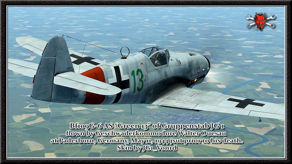 JG1_Vonrd Posted March 6, 2022 Posted March 6, 2022 (edited) This is a Bf109K-4 masquerading as a BF109G-6 AS of JG-1's Geschwaderkommodore Walter Oeusau as it was when he flew out of Paderborn, Germany just prior to his death on May 11, 1944. (The Kurfurst is a better representation of the AS since the AS didn't have the gun bumps). I know that Raptorattacker has already done this skin but since Oeusau became the name of JG1 in his honor and this month is the 30th anniversary of JG1 as a cybersquadron, I felt that I had to do this skin in my own way. I changed a few things on the weathering and also particularly the Balkenkruz on the wings since the guncamera picture of him being hit clearly shows full black crosses on the wing upperside. I hope you don't mind Rap. Skins both with and without swastika are available from Haluter's From Wikipedia: While being the Geschwaderkommodore of JG 1 Oesau frequently received his share of Hermann Göring's anger and frustration over the failure to beat off the Allied bomber offensive. Göring questioned the commitment of commanders who were not flying regularly and thus not really "leading" their respective units. In this context it should be stated that in order not to risk one of the Luftwaffe expert's life [German fighter aces were called Experten], there was an automatic ban on Oesau for further combat flying since his 100th victory. Perhaps the ban was lifted temporarily or bypassed when he was appointed Geschwaderkommodore of JG 1. On the other hand, Oesau might simply have ignored the ban and continued to lead missions. Oesau added several victories over American heavy bombers in the first five months of 1944. On 11 May 1944 one thousand U.S. heavy bombers from Eighth Air Force attacked railway targets in Eastern France and North East Belgium. They were escorted by even more numbers of P-38 and P-51 fighters. Oesau was in bed with influenza. Upon hearing the news, Göring phoned Oesau's staff: Göring – "Is the Kommodore flying?" Staff – "No, he is in bed with fever." Göring – "Yes, yes, I know that kind!", Göring said scornfully, Göring – "He has also turned tired and coward!" Angered by this comment, Oesau took off in a Messerschmitt Bf 109 G-6/AS "Green 13" (Werknummer 20601—factory number) from Paderborn despite a high fever. Leading three aircraft of the Geschwaderstab, the schwarm broke formation over the Ardennes as it approached the bombers. In the dogfight Oesau's wingman reported damage to his machine and he was ordered to break off. Left alone, Oesau faced P-38s and possibly P-51s as well. According to Major Hartmann Grasser, Gruppenkommandeur of III./JG 1, who was on the same mission, there were five P-38s facing Oesau. What followed is unclear as there are several versions. Oesau was chased by 1st Lt. James Leslie Doyle, 1st Lt. Wilbur L. Jarvis III and 1st Lt. James C. Austin, of the 428th Fighter Squadron (474th FG, 9th AF). All three were experienced pilots and chased Oesau from 28,000 feet to tree-top level. In the ensuing 20-minute dogfight, Oesau defended skillfully, though his aircraft was damaged by gunfire. While attempting an emergency landing, his Gustav received a final burst of fire in the cockpit area and crashed into the ground 10 kilometres (6.2 miles) southwest of St. Vith. His body was thrown clear of the aircraft some yards away. According to the "Eighth Air Force Mission Folder for 11 May 1944, Mission 351", Lt. Doyle engaged in a turning dogfight with a pair of Bf 109s, scoring hits on the leader. Doyle had then broken off combat without claiming a kill, unaware that his victim, Oesau, had been killed by a 20 mm shell. Doyle's kill had been the first kill of the 474th Fighter Group in its first combat with the Luftwaffe. There is some dispute regarding who exactly shot down his fighter. Some sources claim that he was shot during the dogfight and while the aircraft was falling to the ground, he was shot at again a few feet above ground, possibly by the Mustangs of 354th FG. Lt Wilbur Jarvis, No. 2 in the flight led by Doyle received a Damaged credit (not a kill) for Oesau's aircraft. Doyle noted bullet damage in the cockpit area and his gun camera footage showed that it was Oesau's Green 13. German records indicated that his death was caused by an explosive shell in the cockpit, his body having several bullet wounds. Later an image from the Gun camera was published (without caption) that purportedly showed Oesau's aircraft from the right side. Oesau was aged 30 at the time of his death. He had a total of 127 kills gained over 300 missions. 27 were Spitfires, 14 four-engined bombers, 44 were scored on the Eastern Front and 9 in the Spanish Civil War. In recognition of his record, JG 1 received the title Oesau in honor of its fallen Geschwaderkommodore. Only Werner Mölders had a similar honor with JG 51 Mölders. Walter Oesau is buried in Meldorf, close to his birthplace and the town museum (Dithmarscher Landesmuseum) has documented his last journey in pictures Edited March 6, 2022 by JG1_Vonrd 5