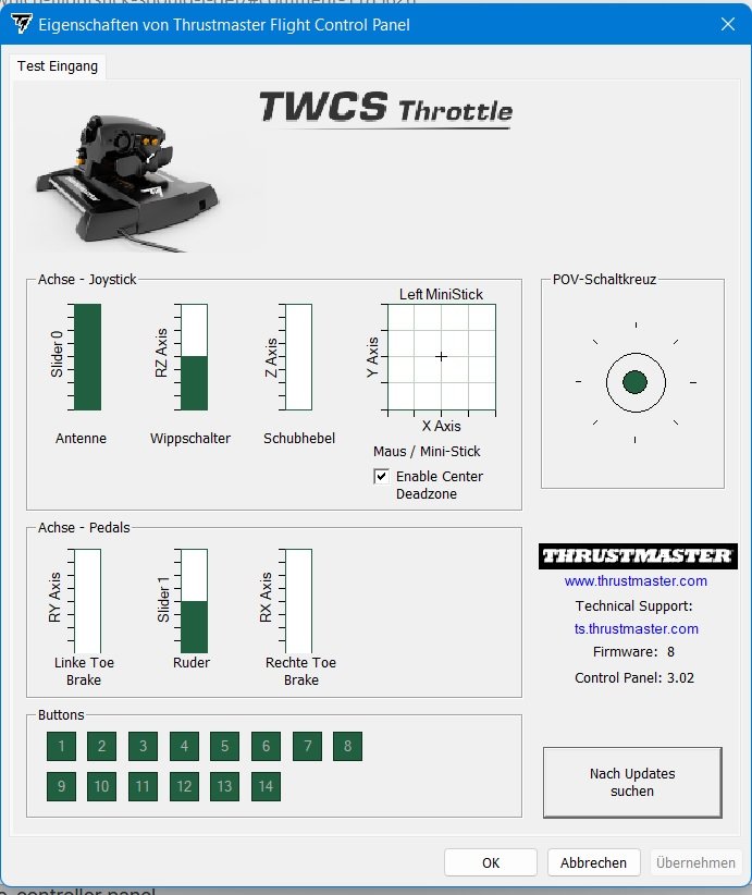 1Sascha Posted May 15, 2022 Posted May 15, 2022 You're talking about the 16000 stick and throttle I assume? If so: How do you connect them to the PC? Do you have to daisy-chain them using TM's own plug or do you simply use one USB-plug for each? Where are/aren't they recognized? In Windows and games? Just in games? Have you installed TM's Target software and/or their own drivers and calibrated the devices in there? Not sure about these two, but a lot of more modern input devices will not work if you calibrate them using Windows' game-controller panel. On my system, with just the throttle, my CP for the throttle looks like this after I installed TM's drivers: Also: You might want to check that your stick is set as your preferred input device "for use with older games". Go into printers and devices, right click on your stick and select "game controller settings". Then select your stick from the list that pops up and click "advanced" underneath. This opens another dialogue where you can set your preferred game controller... make sure your stick is selected and press OK. S.