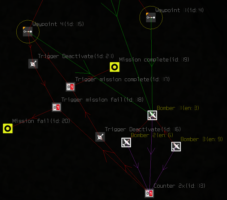 AEthelraedUnraed Posted April 20, 2022 Posted April 20, 2022 (edited) 8 hours ago, GSHWK_Houndstone_Hawk said: My scenario is this: Player is to escort 8 B-25 bombers to target and back again. If all bombers perish, the primary mission objective is failed (easy enough using a trigger counter and 'OnKilledEvent' from each bomber). If however, 4 or more Bombers make it safely to waypoint 4, the primary objective is achieved. As the others have said, the OnMovedTo doesn't work. However, there are other ways to accomplish this (which is probably the reason the Devs didn't implement the OnMovedTo event since it isn't really needed). See this picture: I've tuned it down from 8 to 3 bombers because I'm lazy. The bombers are linked to a counter trigger with their OnPlaneCriticalDamage event. Once 2 bombers have triggered this event (4 bombers in your use case), the mission fails. The Mission Complete event is deactivated so that it won't be possible anymore to complete the mission even if some bombers reach the objective later on. On the other hand, once any of the bombers reach Waypoint 4, it'll trigger the Mission Complete counter, if it's still enabled (so if >4 bombers are still alive). Simultaneously, it'll deactivate the Mission Failed counter so that the mission is now permanently complete, even if some more bombers are shot down afterwards. I hope the general idea is clear; if not, just let us know Edited April 20, 2022 by AEthelraedUnraed 1