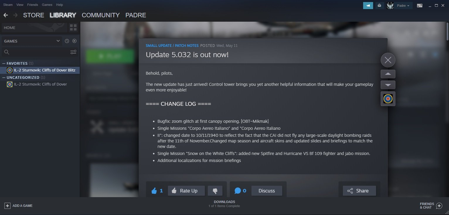 Mysticpuma Posted May 11, 2022 Author Posted May 11, 2022 Got it: "Behold, pilots, The new update has just arrived! Control tower brings you yet another helpful information that will make your gameplay even more enjoyable! ==== CHANGE LOG ==== Bugfix: zoom glitch at first canopy opening. [OBT~Mikmak] Single Missions "Corpo Aereo Italiano" and "Corpo Aereo Italiano II": changed date to 10/11/1940 to reflect the fact that the CAI did not fly any large-scale daylight bombing raids after the 11th of November.Changed map season and aircraft skins and updated slides and briefings to match the new date. Single Mission "Snow on the White Cliffs": added new Spitfire and Hurricane VS Bf 109 fighter and jabo mission. Additional localizations for mission briefings" 1