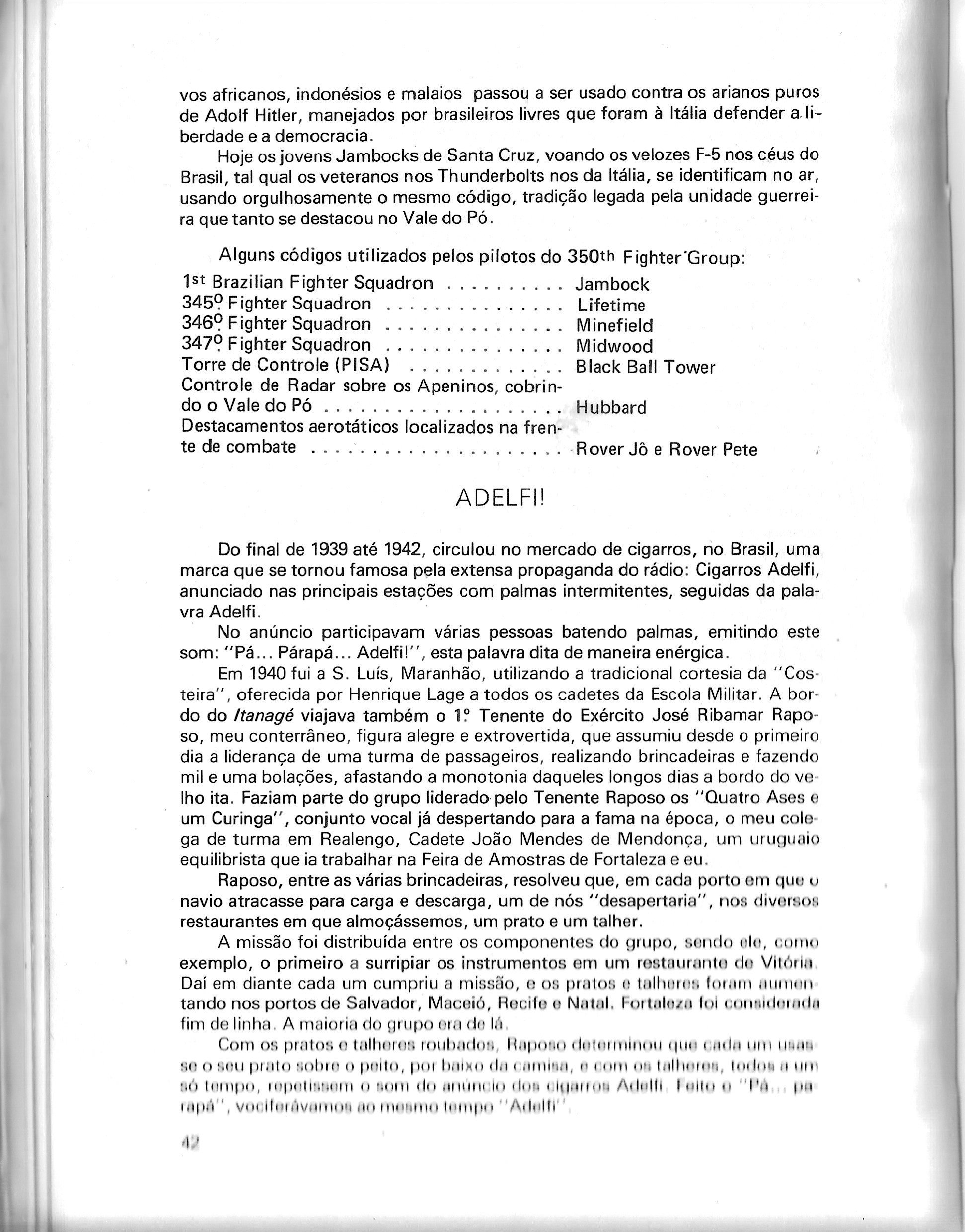 Hauptmann_Wurst Posted June 4, 2022 Posted June 4, 2022 Hi Jason, This awesome game has a brazilian P-47 "Senta a Pua" among the officials skins. So, I do not know if would be possible, insert a official -and historical- 1st Brazilian Fighter Squadron´s callsign in the P-47´s Advance Proprieties callsign box. The official callsign is "JAMBOCK" and it was the 1st BFS's official callsign. Dow below I attached a page from the book Senta a Pua", former 1st BFS pilot in Italy, Brigadier-General Rui Moreira Lima. So, I am trying to make a 1st BFS campaign (part Kuban map that has a lot of similarities with ITO) and as I searched the callsign (in order to make a more immersive campaign) I didnt find it. So, as a suggestion, I kndly ask you to asses the possibility of insert the 1st Brazilian Fighter Squadron´s official callsign: "JAMBOCK" in the callsign box. I recognize that Portuguese is not an easy language, but the callsigns are clear at the top the page, including the callsigns of all US Squadrons (345th,346th and 347th) stationed in Tarquinia and Pisa Airfields and that accomplished missions at Italy Theater of Operations in 1944/1945. In addition, I think the large brazilian community of IL-2 GB's would apreciate if it were possible. Thank you very much! 1