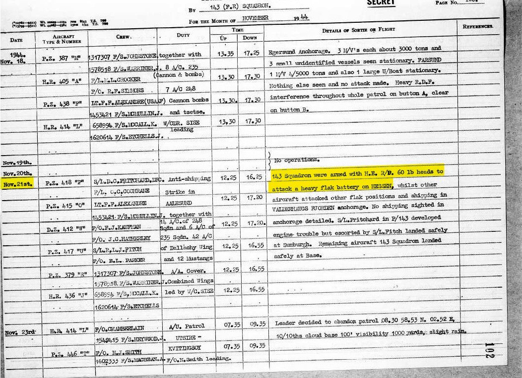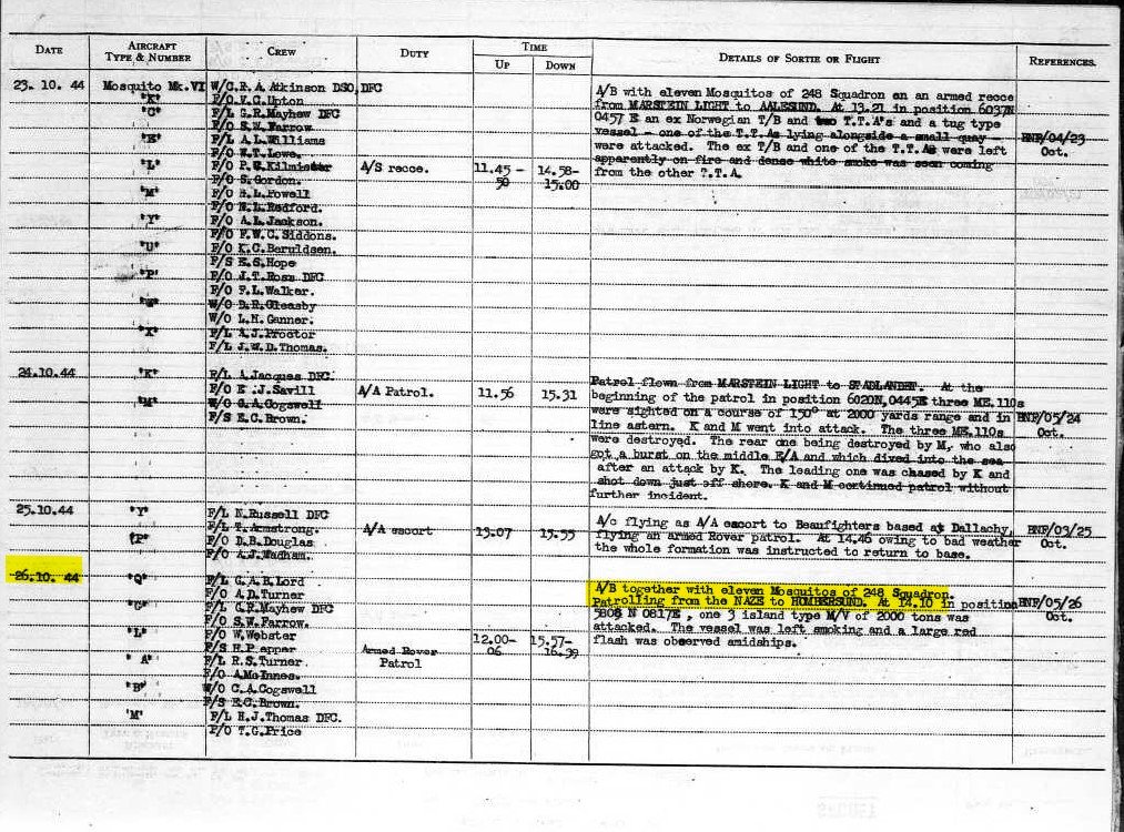 busdriver Posted June 19, 2022 Posted June 19, 2022 (edited) 12 hours ago, Jade_Monkey said: I am reading the Mosquito book by Philip Birtles and it says the following: "In late July (44), unguided rocket projectiles were used for the first time, launched from underwing rails; they were particularly effective against trains." I agree with @Gingerwelsh RPs were only used by Coastal Command Mosquito squadrons and only against shipping targets. RP trials on Mosquitos started ~28 Sep 1944. They were first used on Ops by 143 Sqn (a Coastal Command squadron) on 11 Jan 45 (correction make that 21 Nov 44). 235 Sqn and 248 Sqn (also both Coastal Command squadrons) flew their first Ops with RPs on 3 Feb 45 (according to Bird 26 Oct 44, but their ORBs don't reflect that) And RPs were never carried on a Mk XVIII (the Tsetse Mosquito). As @LukeFF mentioned, 2nd TAF Mosquito squadrons did NOT use RPs. This is the first record of Mosquito Ops with RPs I can find. Air Chief Marshal Sholto Douglas needed to increase the range of his Banff Mosquitoes, a matter which was raised at a conference held at headquarters and subsequently taken up with de Havilland, the manufacturers. He also made a request for an increase in the numbers of Mk XVIII Tsetse Mosquitoes for 248 Squadron, but was rebuffed by the Air Ministry because the rocket projectile installation was beginning to get underway, following the successful trials on 28 September [1944] and in mid-October [1944] of test flights at Hatfield with rocket rails installed under the wings, using HX918 against targets on Ashley Range in the New Forest. Sholto Douglas changed his mind and suggested the Air Ministry should immediately abandon the MkXVIII project and called for all his Mosquito squadrons to be quickly equipped with rockets. Marshal of the RAF Charles Portal, Chief of the Air Staff, agreed to these proposals. The three Mosquito squadrons therefore underwent intensive rocket projectile (R/P) training at a range near RAF Tain on the Moray Firth coast between Invergordon and Dornoch, an RAF launch anchored target markers off Macduff, while arrow markers were placed on the ground. Making their first operational sortie on 26 October [1944] with this new weapon, developed for its present purpose of attacking vessels by Group Captain John D’Arcy Baker-Carr, 235 and 248 Mosquitoes took off at midday, searching between the Naze and Hombersund. Bird, Andrew. A Separate Little War: The Banff Coastal Command Strike Wing Versus the Kriegsmarine and Luftwaffe 1944-1945 . Grub Street Publishing. Kindle Edition. The 235 Sqn ORB entry for 26 Oct 44... Edited June 19, 2022 by busdriver 1 2