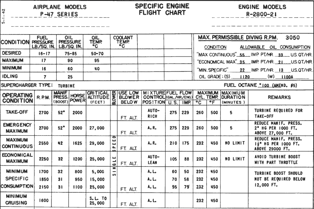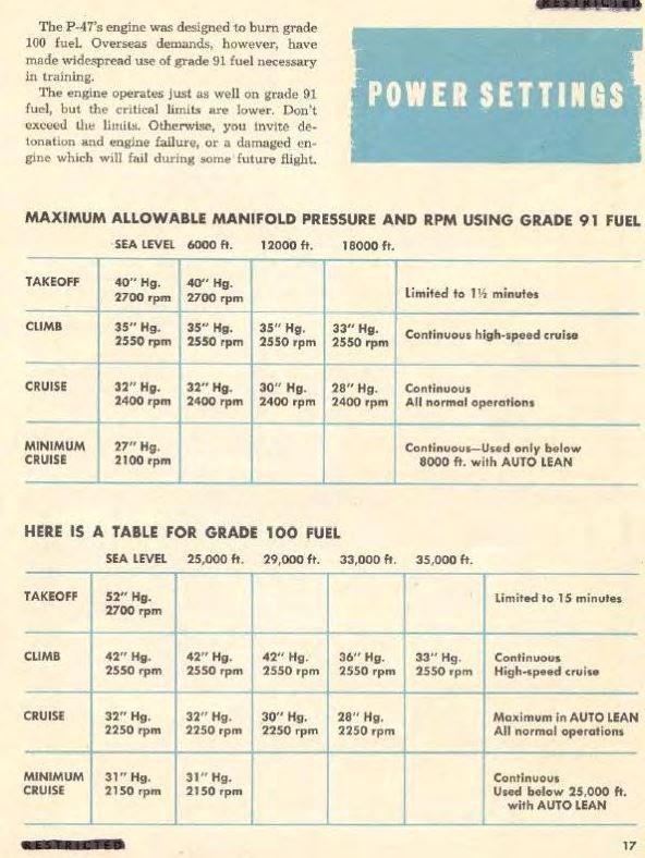 -332FG-Zephyr096 Posted June 22, 2022 Posted June 22, 2022 https://www.spruemaster.com/wp-content/gallery/manual/Republic-P-47-AAF-Manual.pdf This manual is one I've come across in multiple places online; if someone has a source that debunks its historical accuracy please let me know. This seems to be a historical training manual for the P-47D, and refers to the "D-25" as the latest model. The D-25 and D-28 had the same model of R2800 (either the -59 or the -63 variant) as far as I can find online. The issue I'm finding is here: "Used unhesitatingly" specifically contradicts the hard 5-minute timer we have in the game for the D-22 and D-28. It also implies that the combat power timer of 15 minutes is more of a soft limit than a hard limit, although it doesn't provide information on a "combat power" timer in this particular manual for 150 grade fuel. It provides a limit of 15 minutes for "takeoff power" under 100 grade fuel-which in the next section, I have a rather unscientific but still important qualifier for. Additionally, this same manual states: While I understand that modelling an airplane engine accurately is a monumental task, the manual of the plane states that in combat pilots often run over stated limits of their engine "for long periods" yet in-game running over limit for emergency and combat results in a very quick engine death every time. Accurately modelling detonation, overheating, etc. etc. seems like a tall order, but it would be really wonderful if devs could go back over the engine limits for the D-28 at the least. I think the D-22 may also be shorted, although based on the above manual I believe it should have half the total time of the D-28 (but again, be able to use the entirety of the water supply in one go without suffering engine damage or failure provided the engine has not gone outside of the safe operating temperatures). Of course, again, I may be incorrect or this source could be incorrect; if someone with a better background in history than my lifelong interest in WWII and no formal training wants to chime in that would be wonderful. This manual for the P-47 models that used the R-2800-21 variant shows the limit we have in-game of 5 minutes water: The later-war P-47N training manual also refers to a 5 minute limit, but it's written in a way that implies it's to avoid excessive wear during training rather than a hard limit that results in immediate death of the engine upon exceeding the stated timer in a combat situation. I will post a link to the forum where I found these second two manuals, but the manuals themselvse are too large to upload here.https://ww2aircraft.net/forum/threads/p-47-thunderbolt-manuals.5081/ Happy flying, and I appreciate anyone who takes the time to look this over! -Zephyr 9