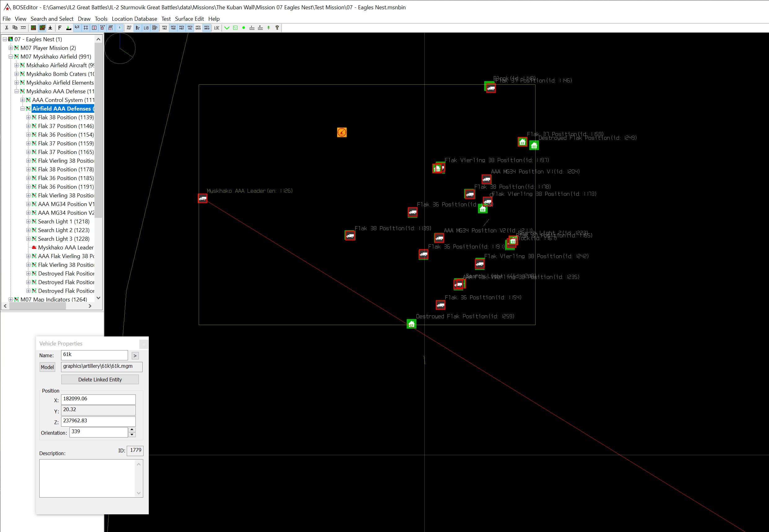 IckyATLAS Posted September 5, 2022 Posted September 5, 2022 (edited) On 9/2/2022 at 5:12 PM, AEthelraedUnraed said: You mean you've found a way to object-link or target-link objects across groups? I just tried out the Search and Select tool, but I can't figure out how to get any found objects into the linked objects list of another object. Mind sharing how you do this? Here a screenshot sequence to explain how to be fast in doing this. The following example is how to target link one object, a 61k AAA unit on the Gelendzhik-1 Airfield (Kuban Map) that is in a group four level deep, to another object which is a Fake Vehicle (Acting as AAA airfield command) in a group three level deep at that is on the Myskhako Airfield, well far from the previous object. But this way of doing works with whatever objects you want. With MCU it is even quicker as you can use the target and object lists and you even do not need to click on one object on the map. Lists can be huge for complex missions and this is why the naming protocol is so important. You can then have them ordered and listed in alphabetical order if you wish. But it is sometimes better to leave as is because the last elements in the list are those that have ben the last created and generally also the ones you work on. Step 1 Selecting the 61k AAA unit You work on the mission tree and you select the object (You need to open the mission tree and go down the groups and open the Artillery unit group you want to work on, and then click on the object (in the tree) and automatically its group will become active and the object will be highlighted on the map as selected. Then you do a Shift-T to create a target link connection. Up to here you do not need any work on the map. In the picture below the Mouse Arrow and the Target arrow text does not appear. I used the PrintScreen key and the overlayed arrow and text are not registered. Step 2 Selecting the target to be linked This time you do the same on the mission tree and go to the group containing the object. A small detail here, you must make the group containing the object you want to click on, the working group. It is not automatic because you have already the previous group active and an object already selected. But here be careful not to select the object otherwise the Target Link action that is bound to the previously selected object will be canceled. You do not see it but here there is the arrow with Target text that is near to this object name Myskhako AAA Leader at the left of the image. Step 3 Link the object Just click the arrow onto the unselected object that is active as it is in the working group. The link is created. In case you do not see the link well, here under without the map. An you can see that the link goes directly to the other object on the map. Edited September 5, 2022 by IckyATLAS 1 2
