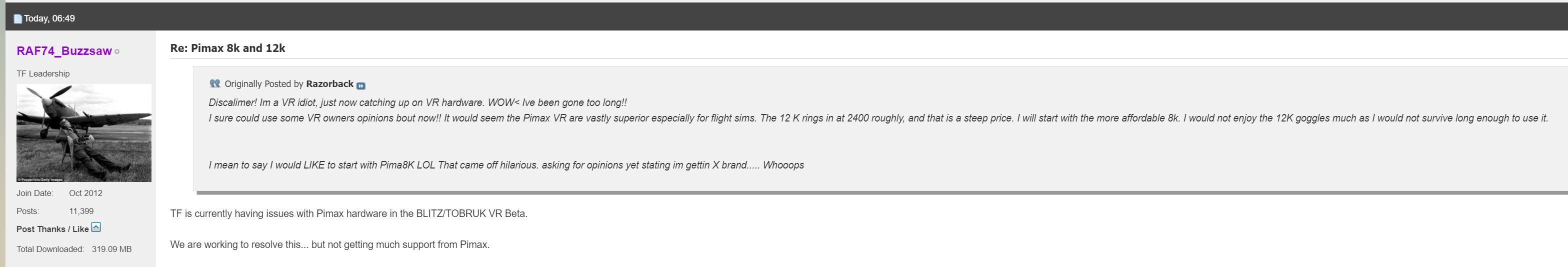 Dagwoodyt Posted September 8, 2022 Posted September 8, 2022 (edited) 9 hours ago, vfr_steve said: Please explain to me (unless I've missed it somewhere) why you are having issues with Pimax headsets? They absolutely ROCK in IL-2. See here... Do you own this Pimax HMD or are you basing your assessment on an infomercial? ? Edited September 8, 2022 by Dagwoodyt