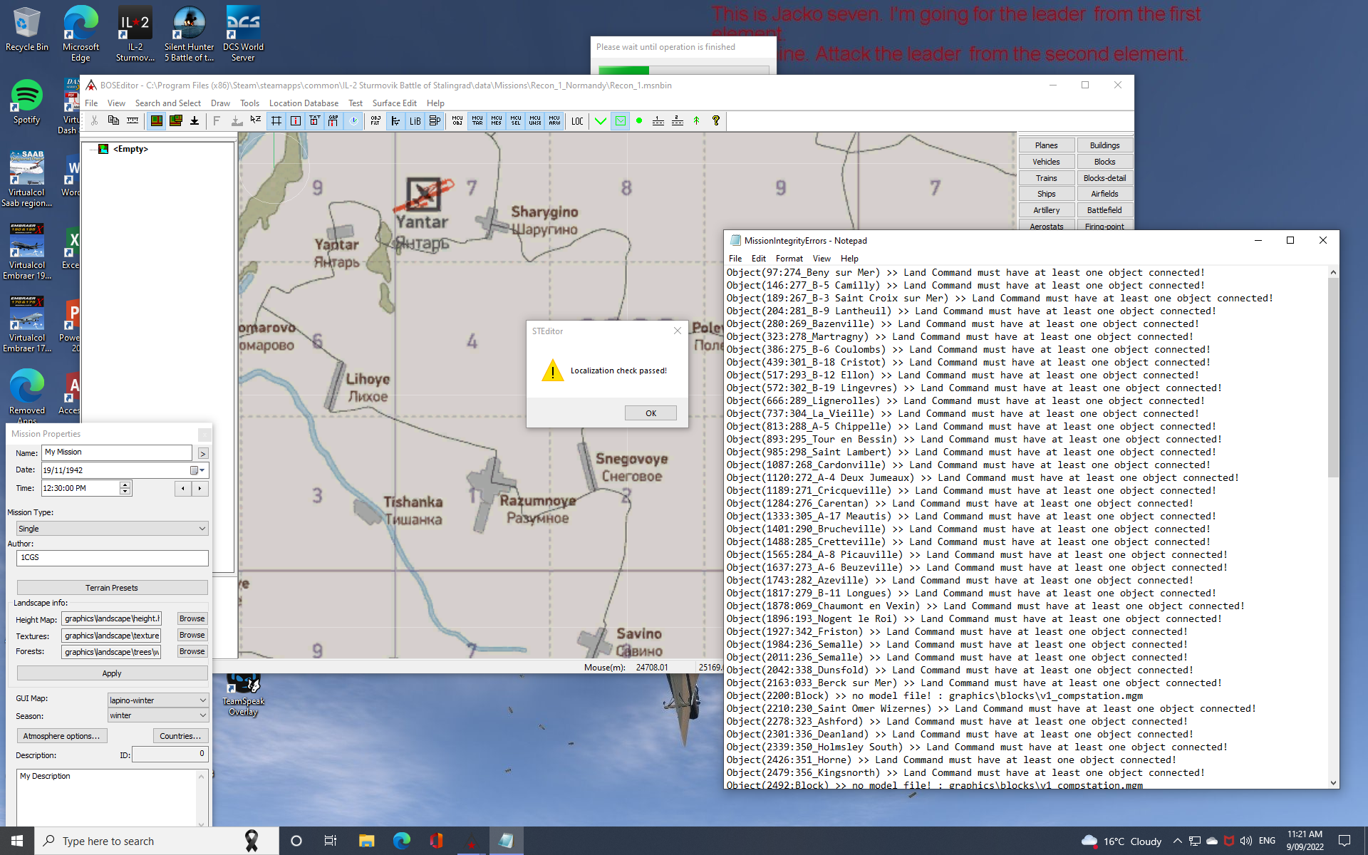DFLion Posted September 12, 2022 Posted September 12, 2022 Firstly, Han, Jason and Teams a great long awaited addition to our flight sim - very well done. I decided to go back to 1943 (using the pre-Normandy Map) and created a mission based on 341 Sqn (free French) where one of their Spitfires flew a "Early morning Radar calibration flight" to calibrate the British Radar prior to their large operation on that day. When I was using the BOSEditor and entering the airfields to the map I got a 'Mission Integrity failed' message then a 'Mission Integrity list' listing all the airfields on the map saying 'land command must have at least one object connected!' Attached is a copy of my early morning mission and a 'screenshot' of the error message. I am pretty sure this is an error, could you have a good look at it? Anyone is welcome to play the mission - watch out for any Luftwaffe intercept when you are not expecting it? DFLion Recon_1_Normandy.zip