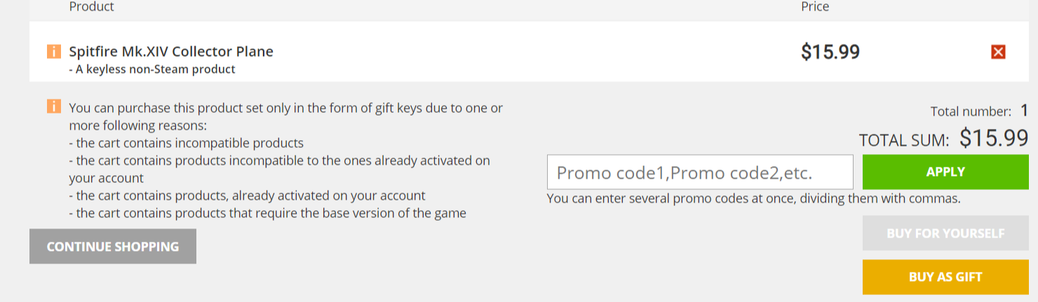 zMethod Posted September 12, 2022 Posted September 12, 2022 I purchased BoN standalone last week and had a quick play through, I am quite new to IL2 so I may be missing something obvious, but I really want to fly the Spitfire so I thought I would purchase the collector plane that is listed as part of the premium package (i dont have the premium, I bought the standard) but it wont let me purchase it? I get the error on the cart page as shown below in the screenshot... any ideas? I have put a support ticket in a few days ago now but not heard anything... what am I missing? I would happily upgrade to premium if that is an option?