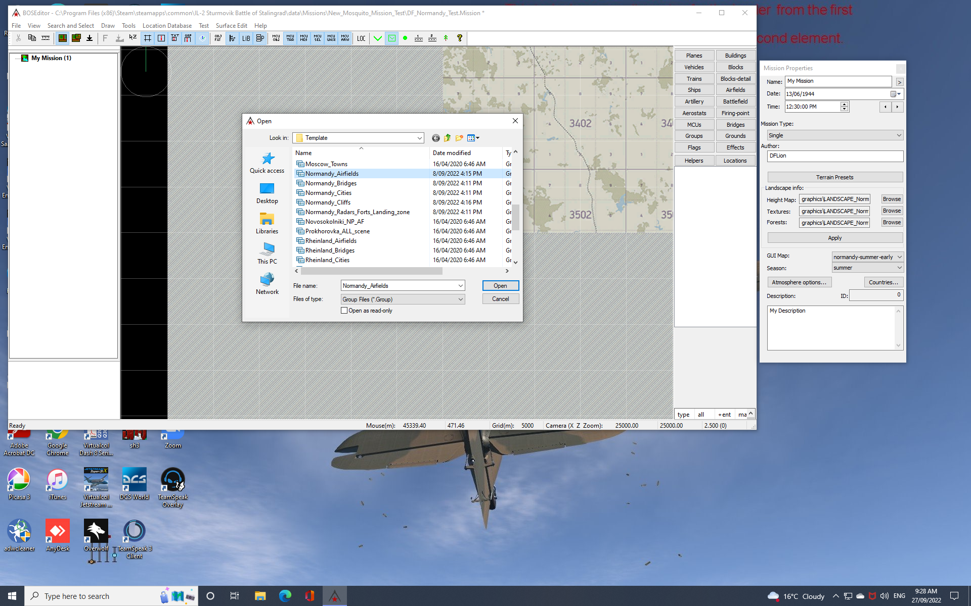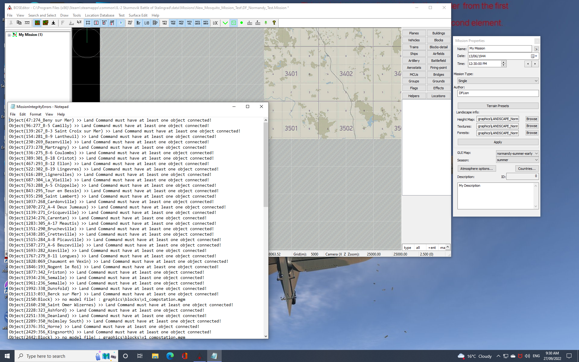 DFLion Posted September 27, 2022 Posted September 27, 2022 Following on from other posts there are definitely problems with the Mission Builder using the new Normandy Map. I've attached 2 screen shots that I took trying to set up the pre-D Day airfields. In the first shot you can see that I have set it up correctly, in the second shot you can see the 'airfield error message' that I can't get rid of. When I put six Spitfire IX's on the airfield (correctly) for take-off, the leader takes-off correctly, the other aircraft go around in circles ground looping. I am sure the 'Command Land MCU' placed permanently in the center of the airfield is the problem. When you download the 'Airfields template' there is no separation between the old and the new airfields - should that be a fix in the next update? DFLion