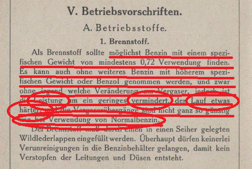Holtzauge Posted February 12, 2023 Author Posted February 12, 2023 (edited) The picture below is from BMW’s own user manual for the “185 PS” BMW IIIa. (BTW: I wonder why they call it the 185 hp engine? ) Note that it says that preferred fuel is “Normalbenzin” with a specific weight of at least 0,72. But that higher specific weight fuel CAN be used OR Benzol without mucking about with the carburetor. However, it also specifically says that performance is LESSENED and that the engine runs more ROUGH when run on these substitutes and that the engine does not run AS WELL as when run on “Normalbenzin”, i.e. ordinary fuel. So here we see that the used of Benzol is as a SUBSTITUTE for the good stuff BMW wants you to run the engine on which is Normalbenzin. So nowhere in this manual is there any word of spicing up your Normalbenzin with Benzol to raise the octane level. In fact, what this tells us is that in the opinion of the manufacturers of the BMW DIIIa engine, Benzol MAY be used as a SUBSTITUTE for the good stuff nothing else. Edited February 12, 2023 by Holtzauge 2 1