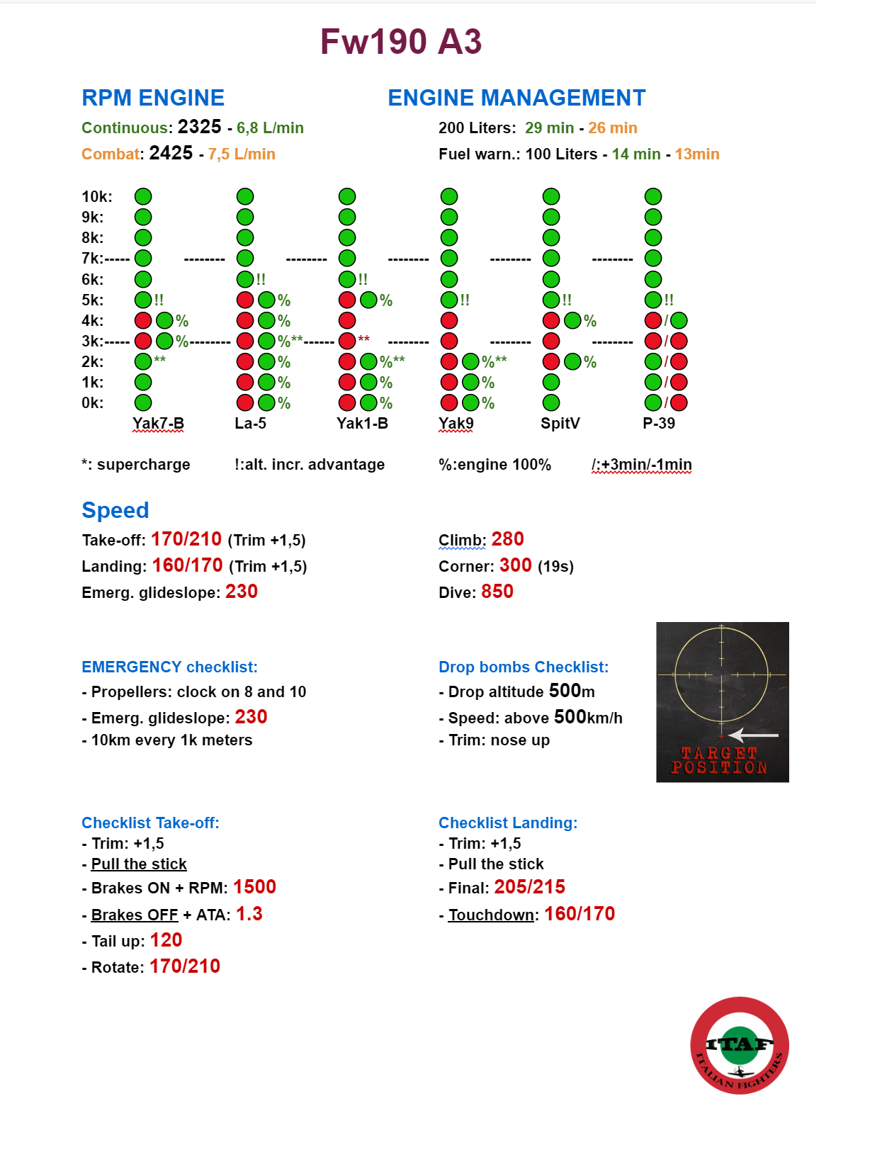 ITAF_Airone1989 Posted October 23, 2022 Posted October 23, 2022 (edited) I created this PDF file Kneeboard V1.1.zipto be used in the game with Openkneeboard (there was already a Topic here on the forum but seems that has been deleted ?♂️), but you can use them even just opening the PDF file. The main advantage over "Pilot notes" is the amount of information that can be written. The folder contain:Bf109 (Bf109 E7 -> Bf109 K4)Fw190 (Fw190 A3 -> Fw190 D9)Macchi e Jets (Mc202, Me262, Ar234)Bombers (Ju87, Hs129, Bf110 E2, Bf110 G2, Bf410, Ju88 A4, Ju88 C6, H111 H6, H111 H16, Ju52) You will find inside: - Engine data about RPM, radiators, etc... - A speed comparison chart per altitude (green dot: you are faster than the enemy - red dot: you are slower than him - % symbol: you are faster just with 100% engine) - Info about speeds (landing, take-off, emergency glideslope) - Checklist for take-off, landing, emergency, etc.. Let me know if something is not clear or if there is some mistake Edited October 24, 2022 by ITAF_Airone1989 4 4 2