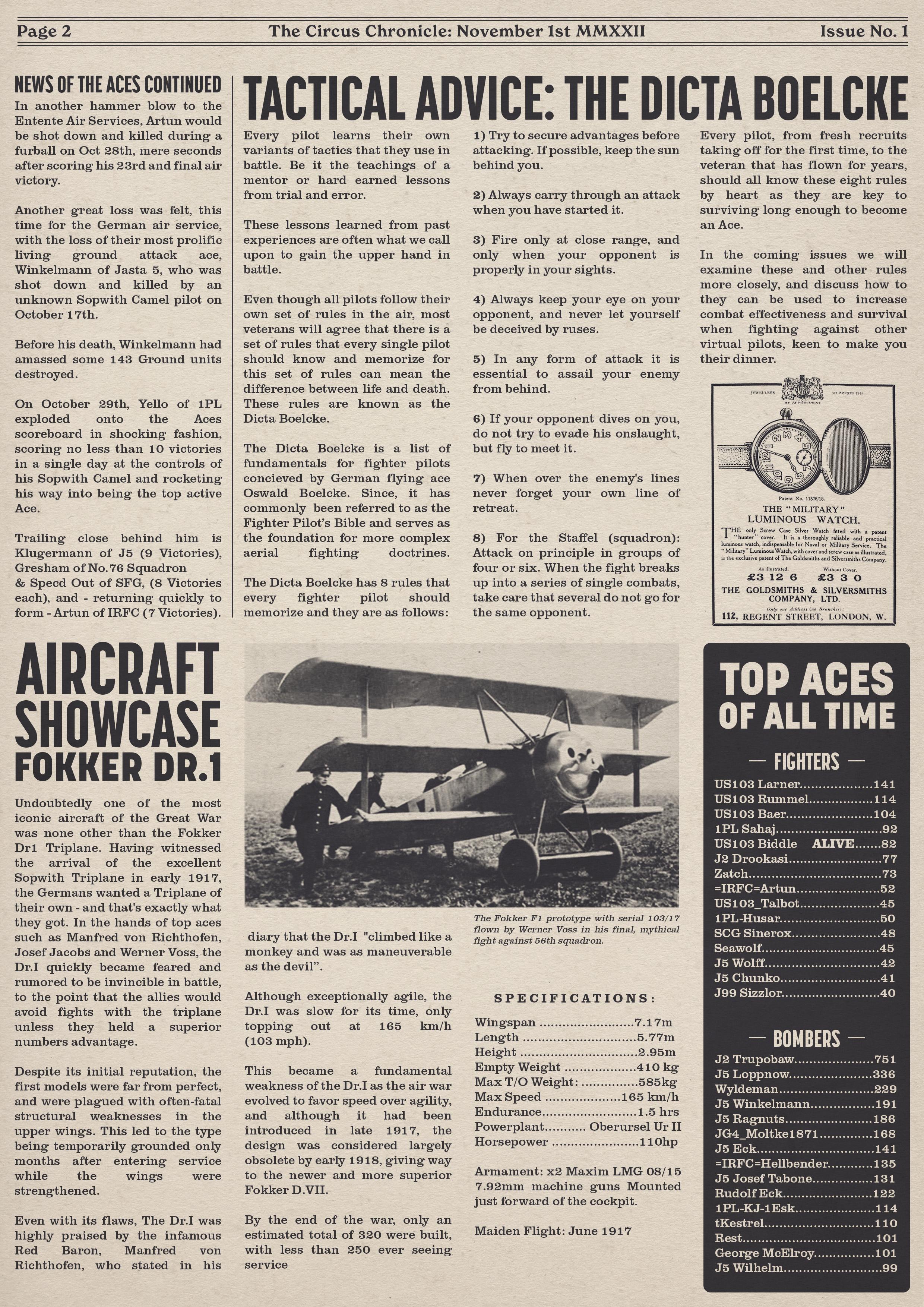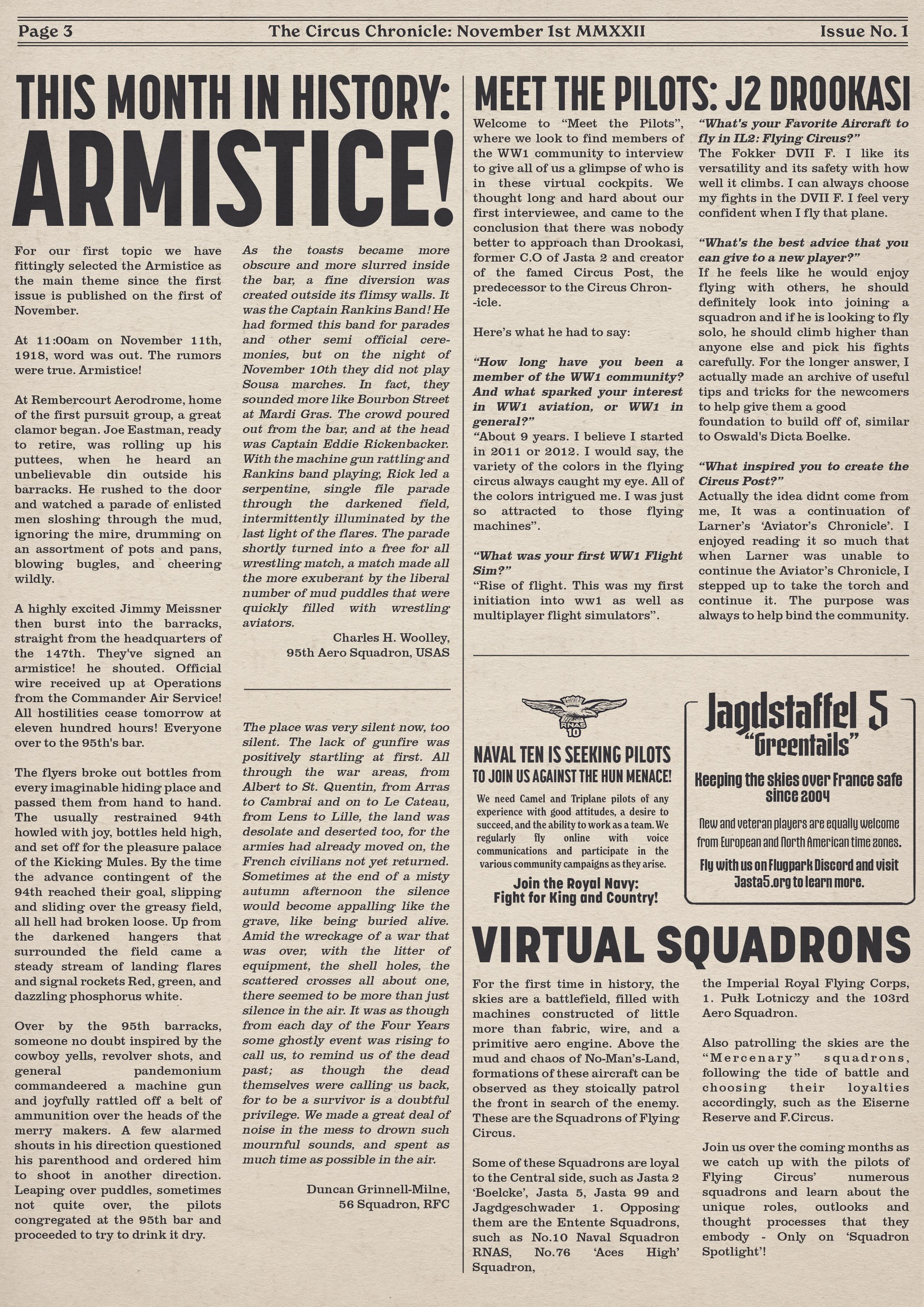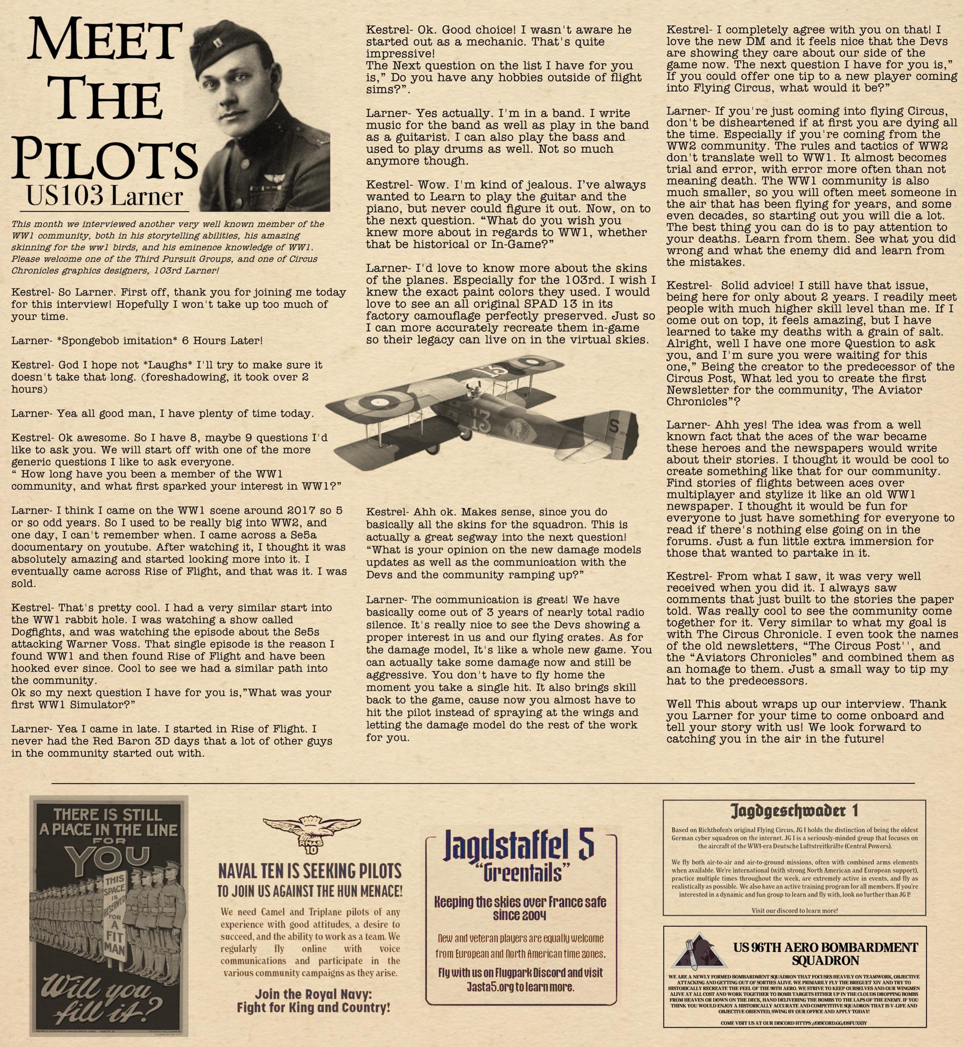 US103tRoosevelt Posted December 1, 2022 Author Posted December 1, 2022 (edited) Welcome back everyone to the Circus Chronicle! This month of December we have Issue No. 002 for you all! The team really enjoyed making this one! And as always on the final days we end up finding small things that require tweaks that lead to screaming in pillows while downing copious amounts of coffee to make sure we get everything just right! If you have any questions, comments, or feedback, please fill free to leave them here, The Circus Chronicles Official Discord or our email at TheCircusChronicles@gmail.com Remember, Everyone is welcome to join us on our Official discord at https://discord.gg/ac39xuJQ Id also like to personally thank Jasta 5 for being this months featured Squadron Spotlight participants! I especially extend my thank you to the gents that showed up for the interview, J5 Baeumer, J5 Sturm, J5 Daedallus, J5 Mai and J5 Matthias! I enjoyed talking with you guys and hope I did the squadron justice in the interview. I hope everyone enjoys the read! -----Helpful Links----- Squadron Recruitments No.10 (Naval) Squadron R.N.A.S Discord-- https://discord.gg/Hxq6weRCzB Jasta 5 Discord-- https://discord.gg/nYcNv3SsG2 Website-- Jasta5.org JG-1 Discord-- https://discord.gg/SM6Uk5XuJ2 Useful Links The Circus Chronile Discord-- https://discord.gg/ac39xuJQ Gorrell’s History 282pg Doc. https://www.fold3.com/publication/80/gorrells-history-aef-air-service/browse Gorrell's History 18 pg Pamphlet —> https://www.fold3.com/pdf/M990.pdf Link for Tactical Advice Credit-- https://encyclopedia.1914-1918-online.net/article/reconnaissance_and_observation Tuesday Night Fights Discord-- https://discord.com/invite/QcQ2AcwZhz Stats Page-- http://stats.jg1.org:8000/en/ -----Team Member Shout Outs----- -Aircraft Showroom Article- US103_Talbot -History Channel Article- Us103_Talbot -News of the Aces Article- US103_Larner -Editors- tKestrel, US103_Larner, US103_Talbot, =IRFC= Artun -Graphics Designers- US103_Larner, =IRFC= bbob Thank you to everyone on the team that has helped out with making this edition of the Circus Chronicle as well as making this little passion project of mine as successful and well received by the community as it has been. I certainly couldn't have done it without you guys! And Thank you readers! Your support means more to me than words can explain! I took up this torch from Drookasi when he was unable to continue making the Circus Post and I hope as that newsletters successor, I hold up to its standard! I decided to do this as a way to bring the community together, if only for a few minutes to read some interesting facts about the war that we virtually fly through as well as a little about the community itself. I remember waiting anxiously for every new release of the Circus Post and wanted to try and bring that back to the amazing people in the ww1 community! I truly thank each and every one of you for reading and hope everyone has a great rest of the year! The Circus Chronicle will return in January 2023! Happy Holidays and fly safe! S! -The Circus Chronicles Team Edited December 1, 2022 by tKestrel Im an idiot: times-2 12 1