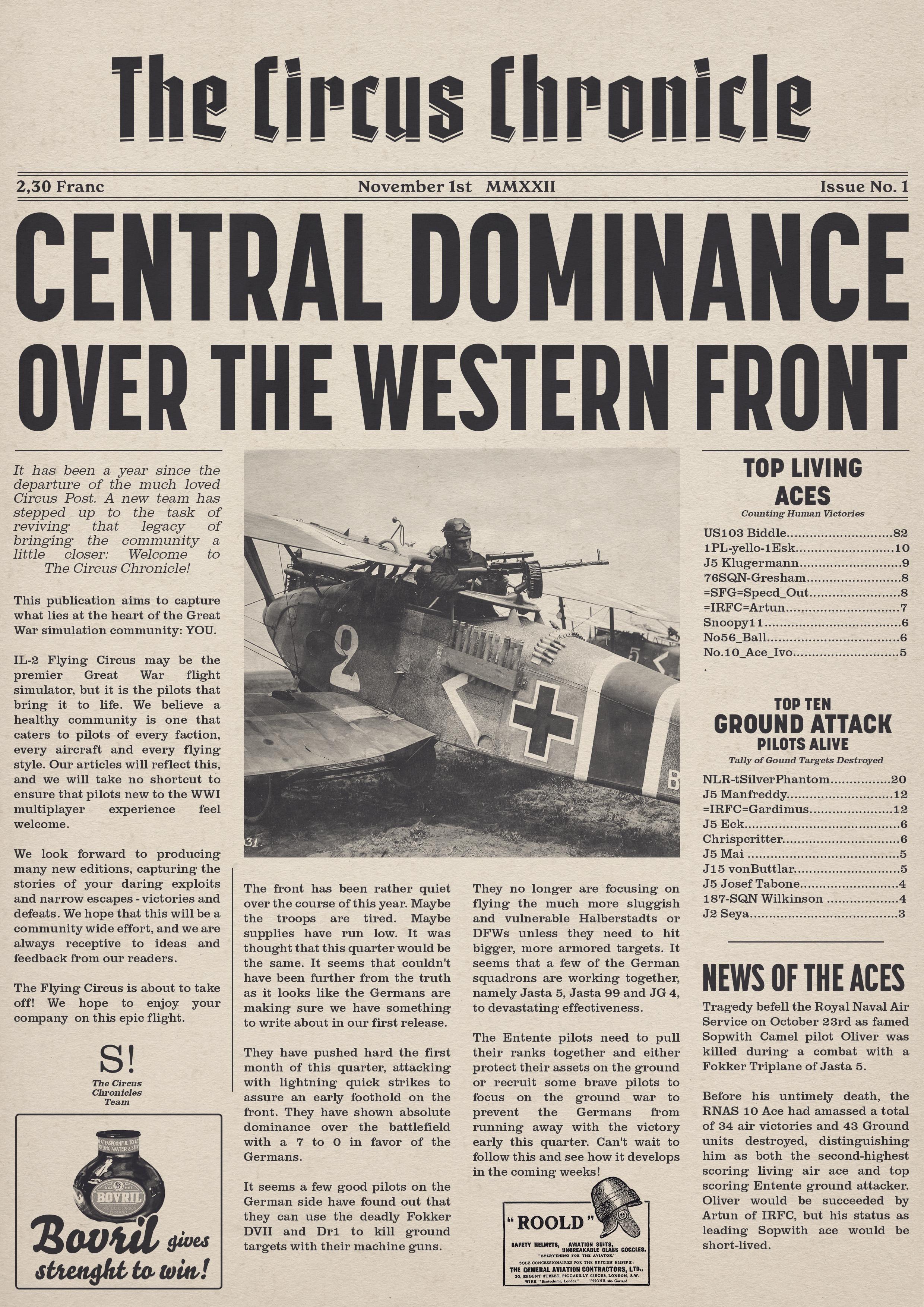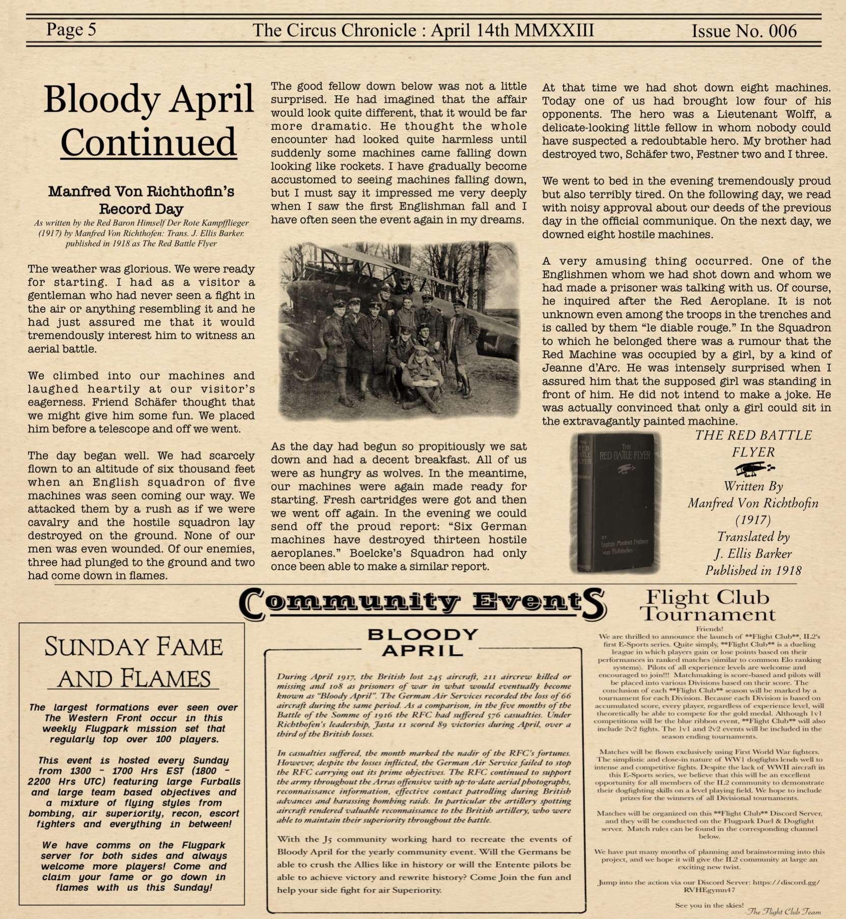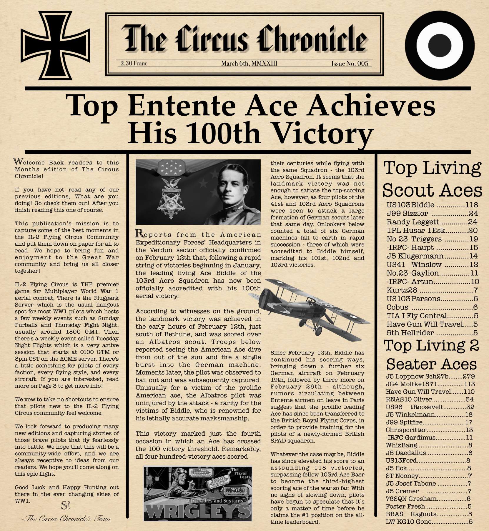 US103tRoosevelt Posted March 9, 2023 Author Posted March 9, 2023 (edited) Welcome Back Readers to yet another later than wanted edition of the Circus Chronicle! I promise by May, we should be back on schedule with releases being on the first of the month, but for now with my personal life being very complex with moving to a new city over an hour away and getting a new job. This is the biggest reason The paper keeps being a few days to a week late the last few editions. Things will be back on track after everything is settled on my end, so I thank each and every one of you for your patience. I would also like to extend a personal Thank You to a member of our community, =IRFC= G0rgonP0rnstar. I was on youtube recently when I seen Issue No. 004 and was like “wait a second….” And after a second of realization that I was in fact on Youtube. I realized that G0rgon was helping to promote The Circus Chronicle. And It more than just made my day. I hope this thank you is enough to express my gratitude bro! I owe you one. With that being said! G0rgon makes a lot of very entertaining Flying Circus content on youtube. Please go check him out if you get into watching WW1 combat like I do at https://youtube.com/@flightknight4269 And now! Without Further Ado, The Circus Chronicle Issue No. 005 Fresh off the Press! -----Helpful Links----- Squadron Recruitments - No.10 (Naval) Squadron R.N.A.S Discord- https://discord.gg/Hxq6weRCzB - Jasta 5 - Discord--https://discord.gg/nYcNv3SsG2 - Website-- Jasta5.org - JG-1 - Discord--https://discord.gg/SM6Uk5XuJ2 -US96th Aero Bombardment Squadron -Discord https://discord.gg/MKNcUMUA Useful Links The Circus Chronile Discord-- https://discord.gg/ac39xuJQ Tuesday Night Fights -Discord-https://discord.com/invite/QcQ2AcwZhz -Stats Page--http://stats.jg1.org:8000/en/ Pilots Honor Roll awards https://forum.il2sturmovik.com/topic/54929-pour-le-merite-blue-max-and-distinguished-service-orders-and-higher-awards/ - Website - www.flugpark.org -----Team Member Shout Outs----- -Meet The Pilots- US93_Wright -FrontLine Affairs- tKestrel -Headlines Article- No.23 Triggers -Editors- tKestrel (Lead Editor), US96_Wright, No.23 Triggers, No.23 Gaylion Edited March 9, 2023 by US96_tRoosevelt 8