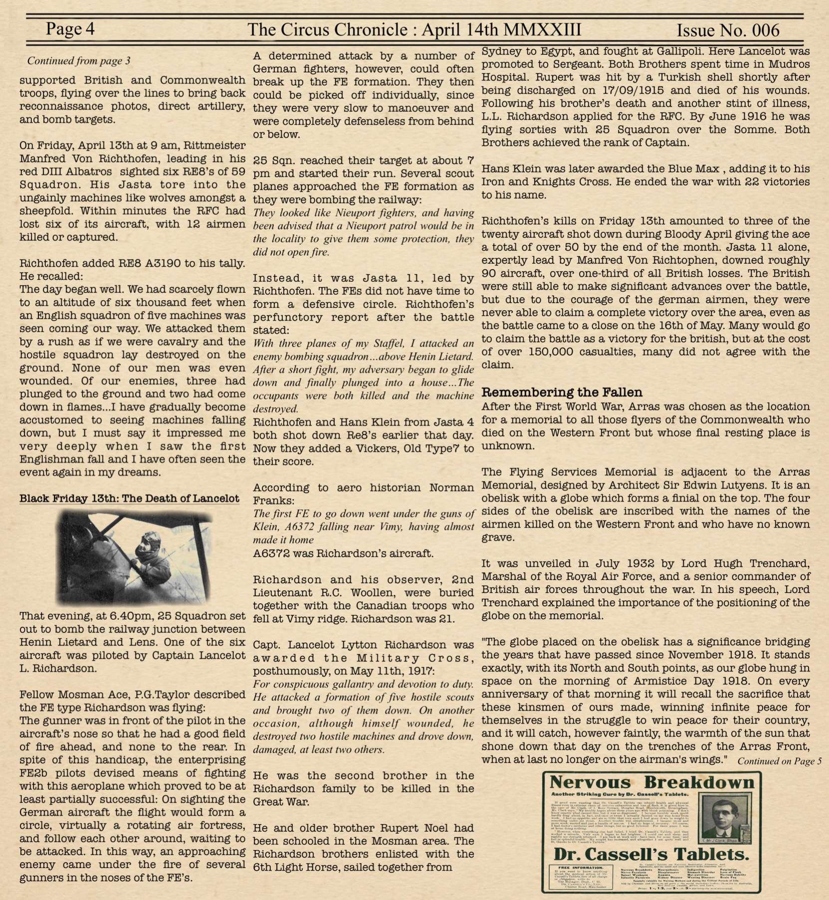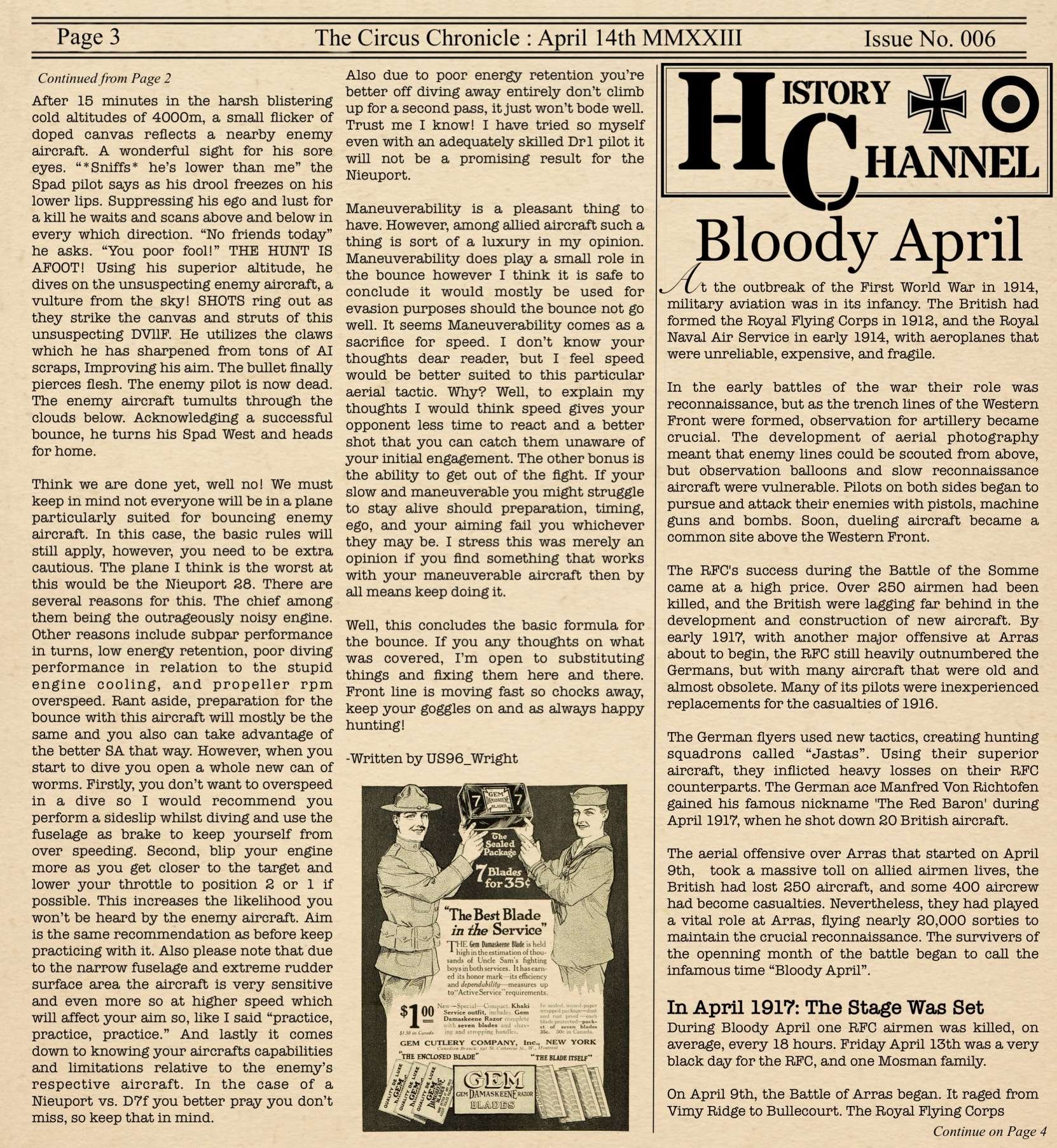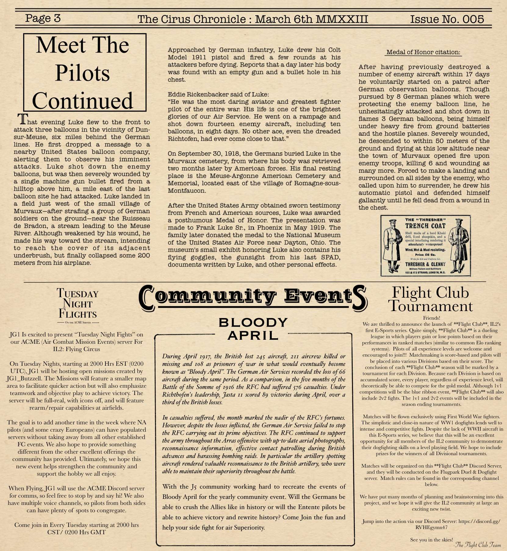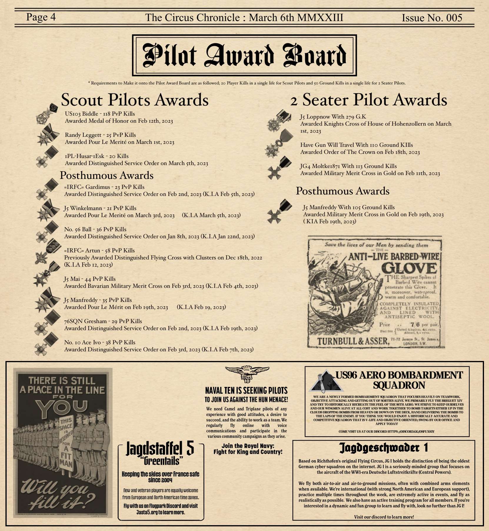US103tRoosevelt Posted March 9, 2023 Author Posted March 9, 2023 (edited) Welcome Back Readers to yet another later than wanted edition of the Circus Chronicle! I promise by May, we should be back on schedule with releases being on the first of the month, but for now with my personal life being very complex with moving to a new city over an hour away and getting a new job. This is the biggest reason The paper keeps being a few days to a week late the last few editions. Things will be back on track after everything is settled on my end, so I thank each and every one of you for your patience. I would also like to extend a personal Thank You to a member of our community, =IRFC= G0rgonP0rnstar. I was on youtube recently when I seen Issue No. 004 and was like “wait a second….” And after a second of realization that I was in fact on Youtube. I realized that G0rgon was helping to promote The Circus Chronicle. And It more than just made my day. I hope this thank you is enough to express my gratitude bro! I owe you one. With that being said! G0rgon makes a lot of very entertaining Flying Circus content on youtube. Please go check him out if you get into watching WW1 combat like I do at https://youtube.com/@flightknight4269 And now! Without Further Ado, The Circus Chronicle Issue No. 005 Fresh off the Press! -----Helpful Links----- Squadron Recruitments - No.10 (Naval) Squadron R.N.A.S Discord- https://discord.gg/Hxq6weRCzB - Jasta 5 - Discord--https://discord.gg/nYcNv3SsG2 - Website-- Jasta5.org - JG-1 - Discord--https://discord.gg/SM6Uk5XuJ2 -US96th Aero Bombardment Squadron -Discord https://discord.gg/MKNcUMUA Useful Links The Circus Chronile Discord-- https://discord.gg/ac39xuJQ Tuesday Night Fights -Discord-https://discord.com/invite/QcQ2AcwZhz -Stats Page--http://stats.jg1.org:8000/en/ Pilots Honor Roll awards https://forum.il2sturmovik.com/topic/54929-pour-le-merite-blue-max-and-distinguished-service-orders-and-higher-awards/ - Website - www.flugpark.org -----Team Member Shout Outs----- -Meet The Pilots- US93_Wright -FrontLine Affairs- tKestrel -Headlines Article- No.23 Triggers -Editors- tKestrel (Lead Editor), US96_Wright, No.23 Triggers, No.23 Gaylion Edited March 9, 2023 by US96_tRoosevelt 8
